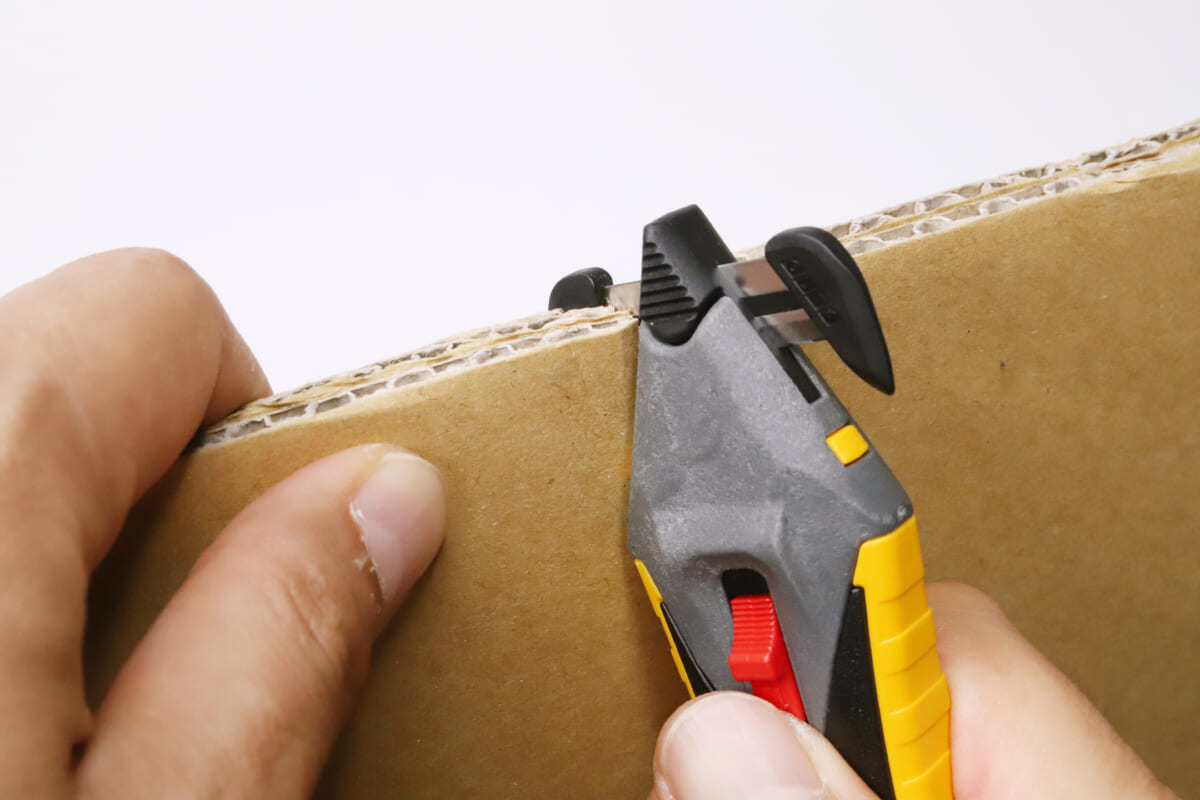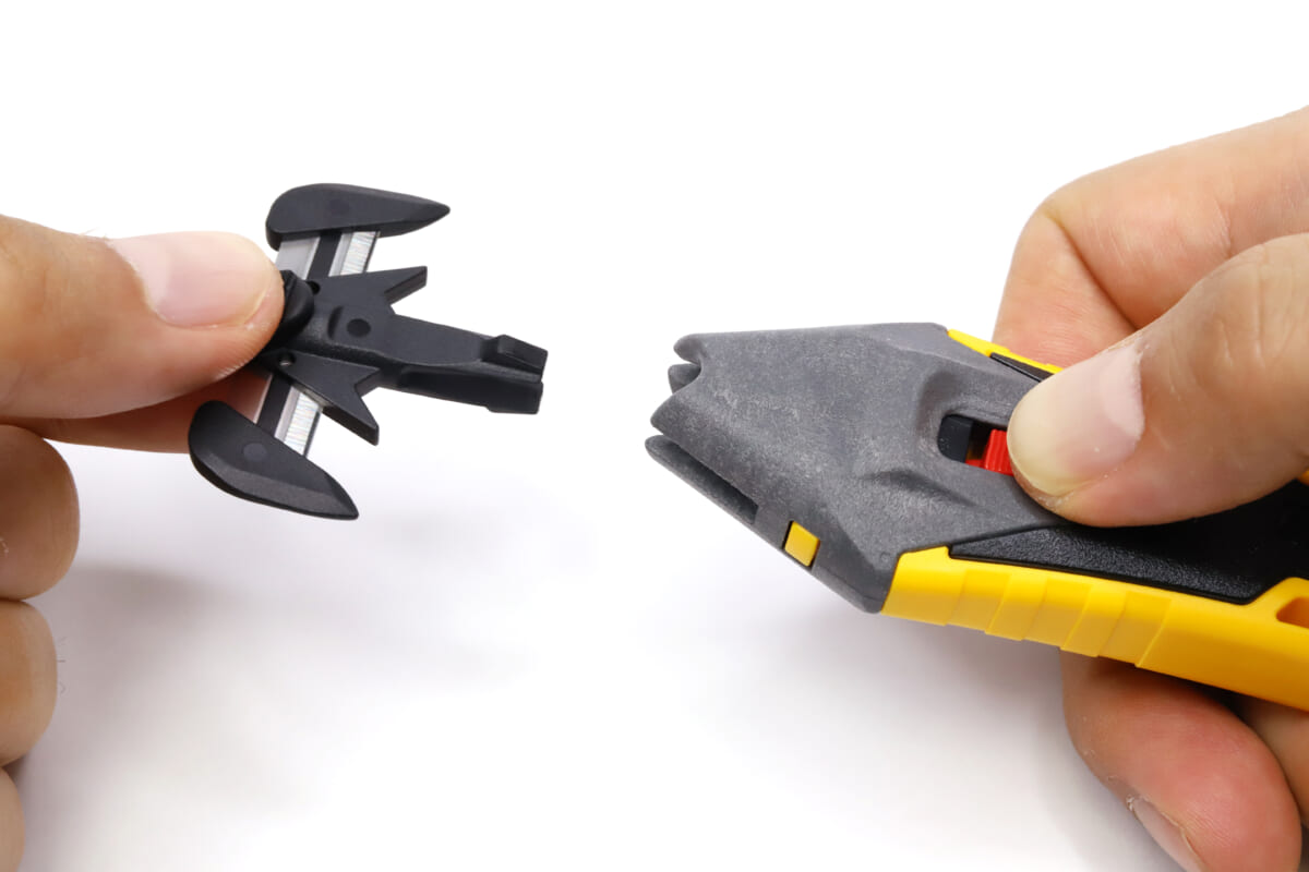 さらには、刃周辺もいろいろとバージョンアップされている。まず、露出している刃の長さが約4mmから約7mmへと変更。これは単純に、カットが可能な幅が広くなったと言うこと。つまり、一般的なダンボールを2枚重ねてカットして分解、なんてこともできるようになったわけだ。