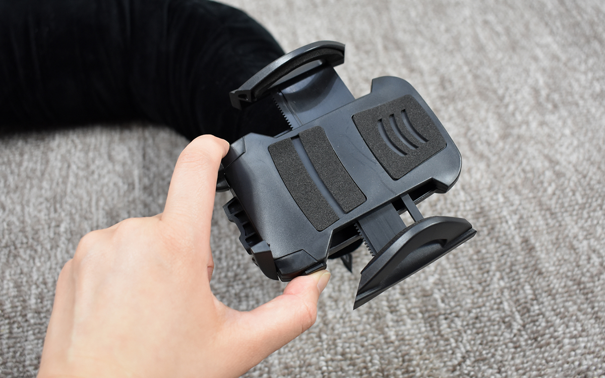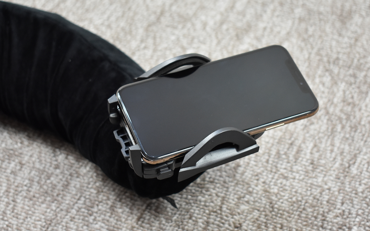 クッションの先端についたスマホホルダーは、幅95mm・厚み20mmまでのスマートフォンに対応。縦横どちらにも回転し、見るものに合わせて自由自在に向きを変えることができます。体に巻いてクッションの代わりにすればハンズフリーでスマホを楽しめるので、腕の疲れに悩むこともありませんよ。
