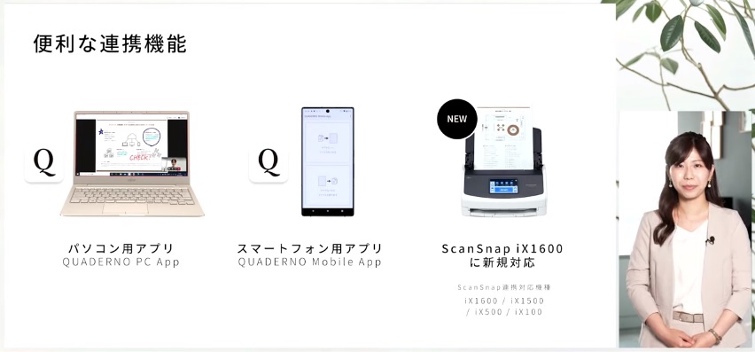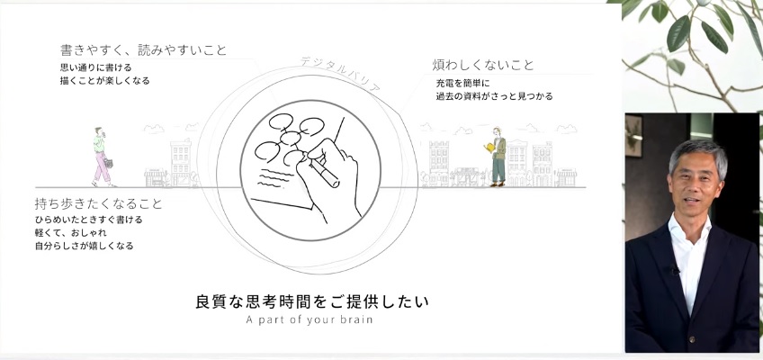 竹田副社長によると、クアデルノが開発された背景には「オフィスから紙をなくしたい」という思いがあったとのこと。昨今企業に求められる情報セキュリティや環境課題の観点から、紙の書類の利用をやめてデジタル化を進めるメリットがあるとし、デジタルならではの利便性とアナログの良さを両立させるデバイスとしてクアデルノが開発されました。