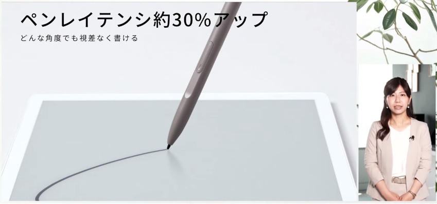 従来モデルからの大きな変更点としては、付属のデジタルペンがバッテリレス仕様になったことも見逃せません。従来モデルでは本体とは別にペンを充電する必要がありましたが、新モデルでは充電不要で書き込むことができるようになりました。