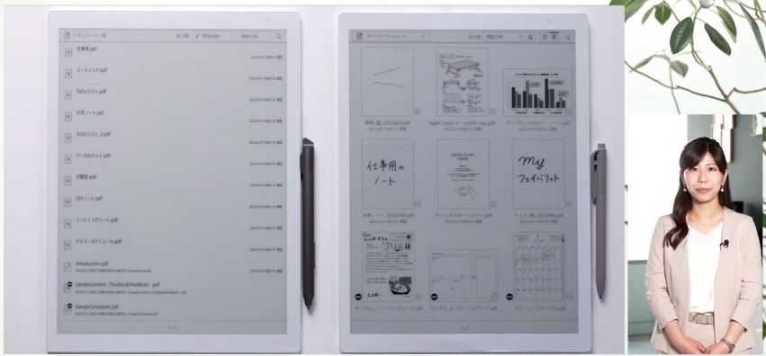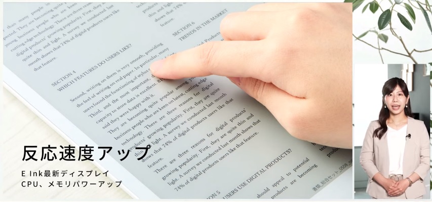 新モデルでは、従来の「紙のように読める・書ける」という特徴はそのままに、基本スペックを大幅にアップ。CPUの性能が上がったことにより反応速度が約20%向上し、ページ送りやドキュメントの切り替えなど、よりスムーズな操作感を実現しました。さらに、最新のE inkディスプレイによりコントラストが向上したほか、保存ファイルをサムネイル表示する新UIの採用により検索性もアップしています。