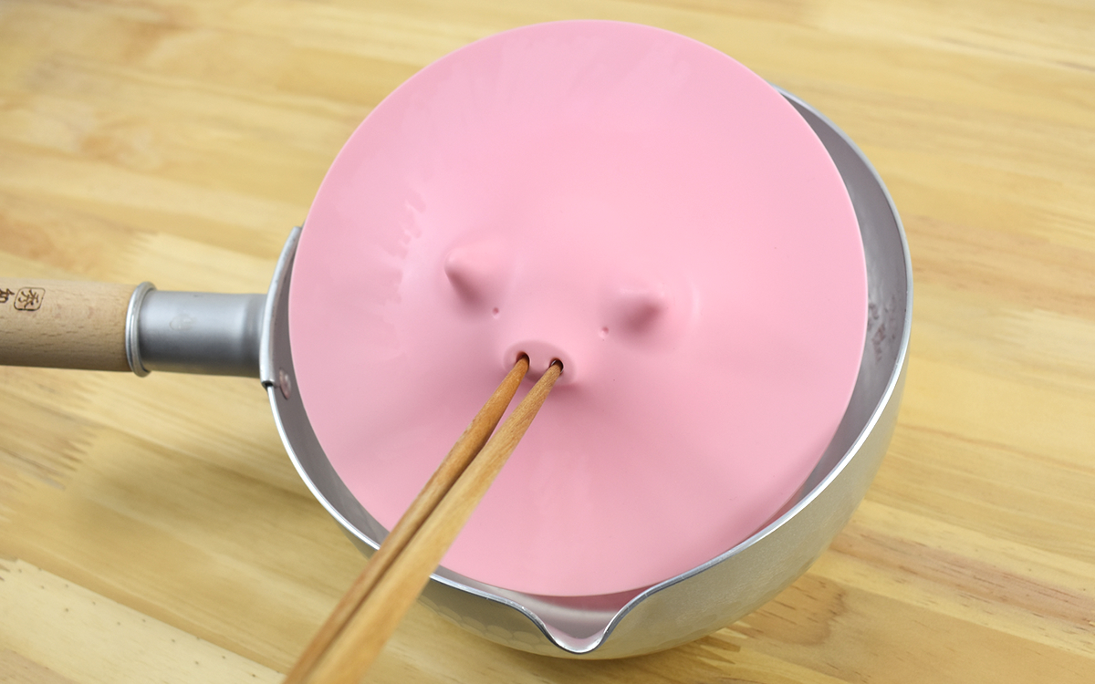 同商品で注目したい特徴の1つが“鼻の穴”。今回は火を使っていませんが、実際に使用すると鼻の穴から湯気が出るユーモラスな姿を見られるそう。また菜箸を通すこともできるので、熱くなった落としぶたに直接触れる必要がありません。