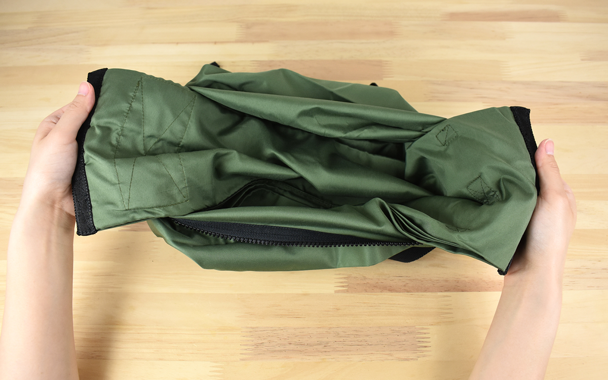 畳み方は簡単で、まずバッグの内側にあるテープを引っ張って裏返しましょう。あとは平たくなったリュックサックを半分に畳み、クルクル巻いていくだけ。パっとしまえるので、急いでいるときも安心です。