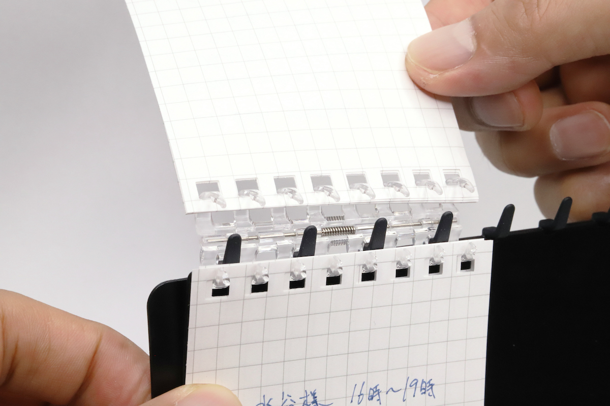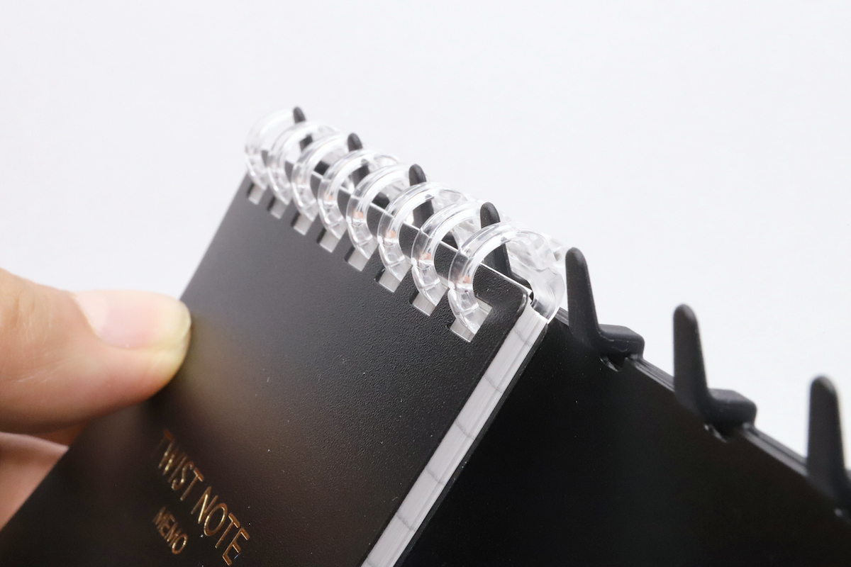 では、どうするか? メモ帳のリングをパカッと開いて大事な情報のページを取り出したら、それもリング穴をクシ歯にかけておくだけでいい。リング穴を破らずにページを抜き差しできる「ツイストノート」のメリットが、ここで活きてくるのだ。