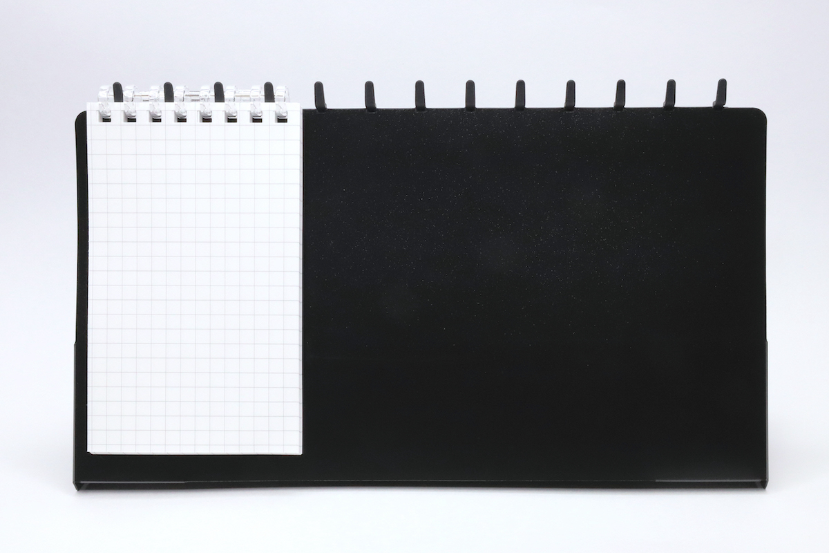 自立するスタンドボードの上辺には、クシのような突起が何本も突き出して並んでいる。まずスタンバイ状態にするために、ボード付属の「ツイストノート メモサイズ」のリング部分を、このクシ歯にひっかける。場所はどこでもいいが、使いやすいのは左右どちらかの端だろう。ちなみに使用するメモ帳は、同社の「ツイストリング」を使用しているものが前提となる。