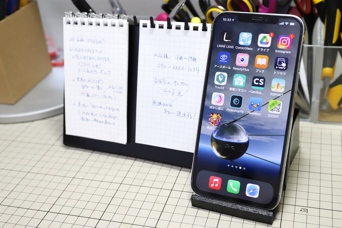 ちなみに筆者は、このボードをちょっと改造して、右端にスマホを立てかけられるようにしてある。「ツイストノート メモサイズ」とiPhone 12 Pro Maxの横幅がほぼ同じくらいなので、面の埋まり方がしっくりくるのだ。スチレンボードを切って組むだけの簡単改造なのだが、これもまた便利である。