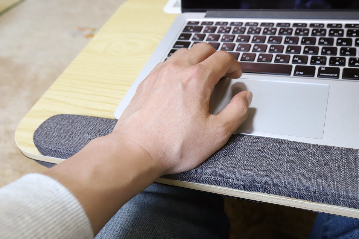 手元側には、天板が傾いた際にPCがすべり落ちないように、ストッパーが付いている。しかも、このストッパーはクッション素材なので、アームレストも兼用しているのだ。この手の膝上デスクは他メーカーからもあれこれ発売されているが、アームレスト付きは比較的レア。作業中、加熱したPCから手首をちょっと離して休ませられるのは、地味にありがたい。