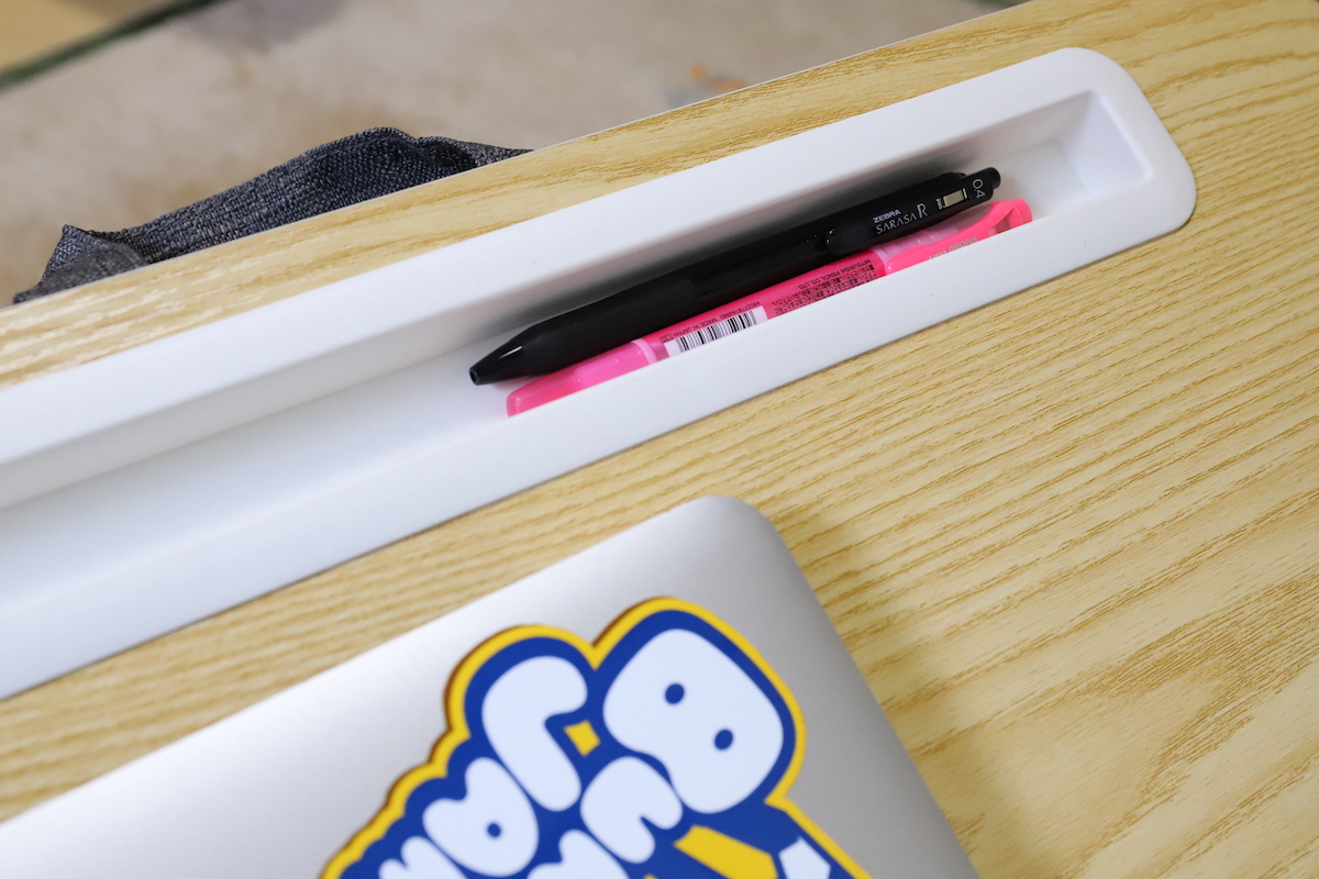 端にあるスリットは、筆記具を置いておけるペントレー。膝上デスクは基本的に傾斜ゼロ状態で使われることがないので、ペンが転がり落ちないようにできる置き場がないと、使いにくいのだ。
