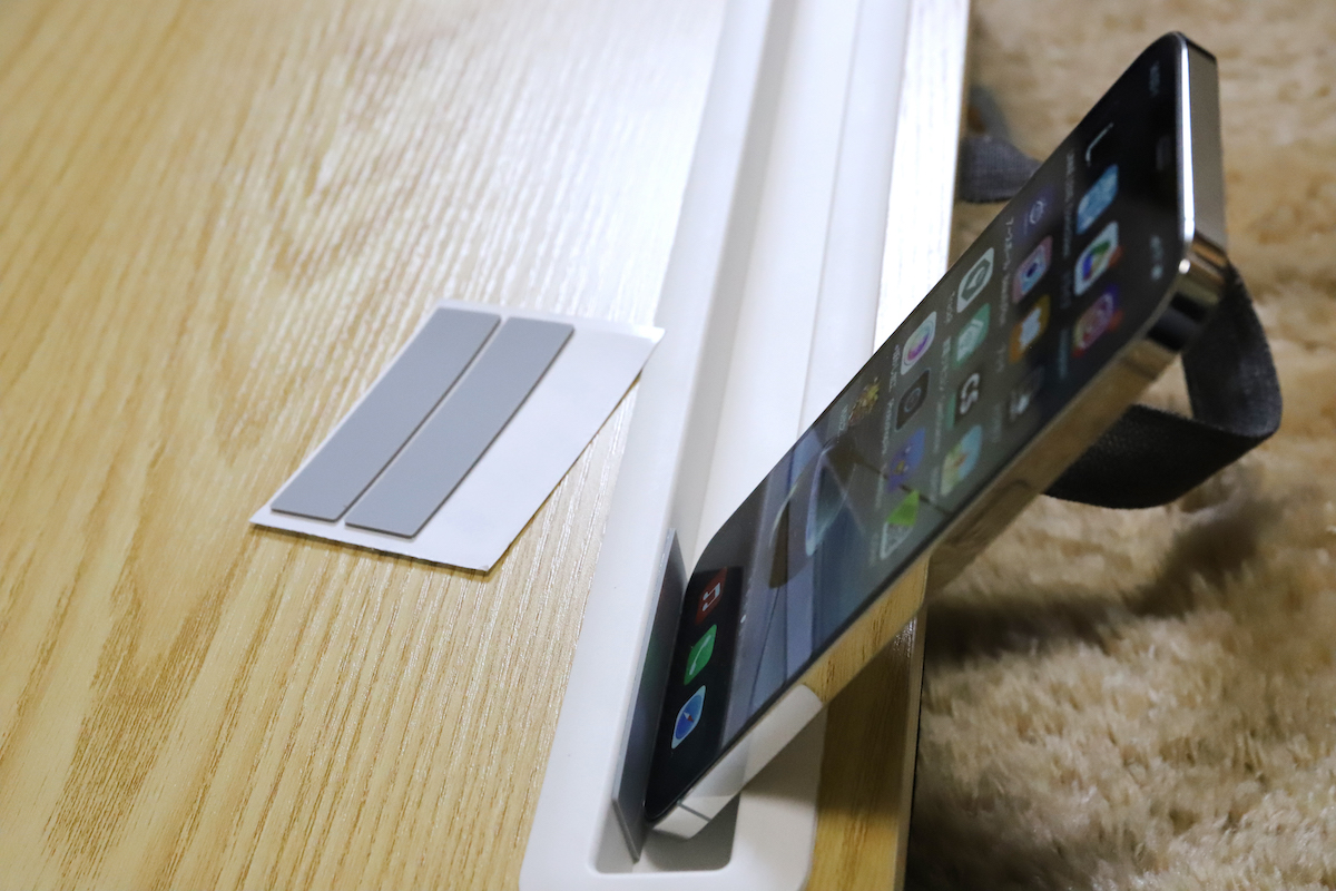 さらに、内側に付属の滑り止めシートを貼れば、スマホやタブレット(最大13.5インチサイズまで対応)を立てるスタンドとしても機能する。スマホも膝上デスクに平置きするとすべり落ちやすいので、こういった場所に固定しておいた方が使いやすい。