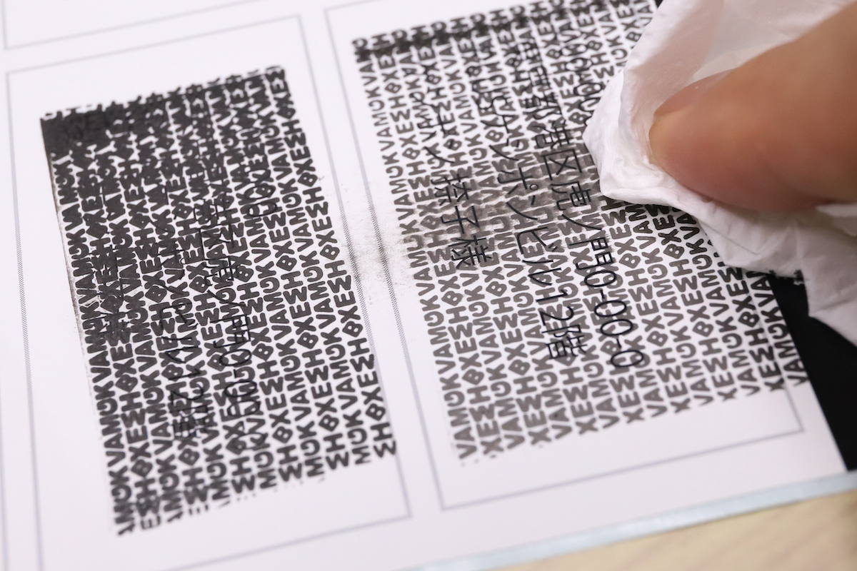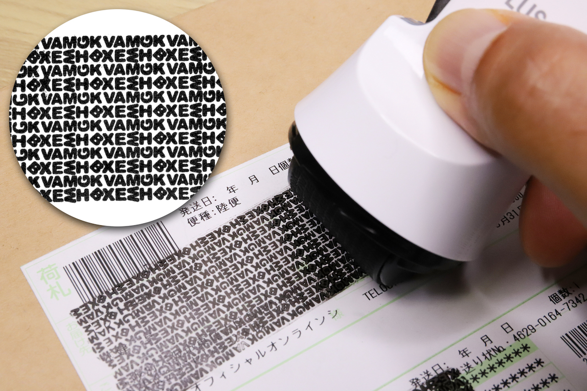 宛名ラベルや郵便物などに印刷された内容は、例えば油性マーカーなどで黒く塗り潰しても、意外と読み取れてしまう。ところが、上から特殊な文字パターンを捺印すると、あら不思議。これだけで非常に読み取りづらくなってしまうのである(頑張れば読めてしまう可能性もあるが、個人情報抜き取りに対する抑止力としては充分)。