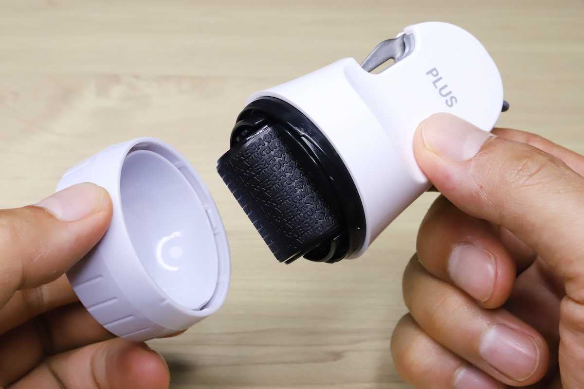 気になったのは、キャップの部分だ。従来のローラーケシポンシリーズは、ボタンを押すだけでキャップが開いてローラーが出てくるノック式(戻すのもワンノック)だったので、ローラーケシポン 箱用オープナーでは、わざわざキャップを着け外しする手間が増えてしまった。