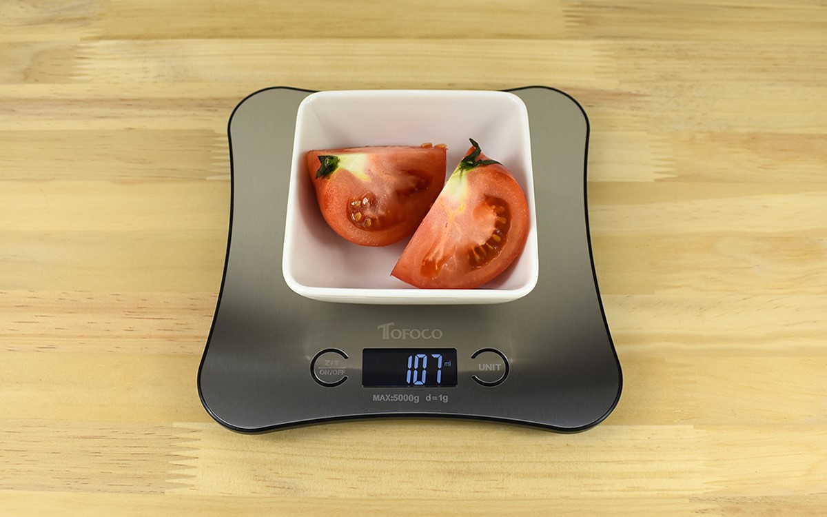 実際に食材の重さを量ってみたところ、メインの計量機能も使いやすさ抜群。LCD液晶ディスプレイに表示される数字が大きく、パっと結果を把握できて好印象です。ディスプレイはバックライト付きで、薄暗い場所でも計量結果が見づらくありません。