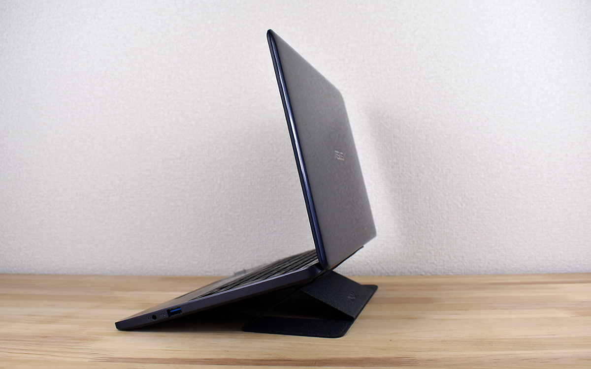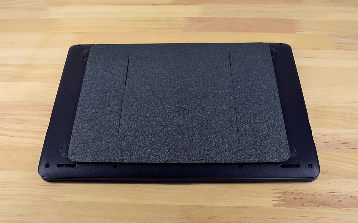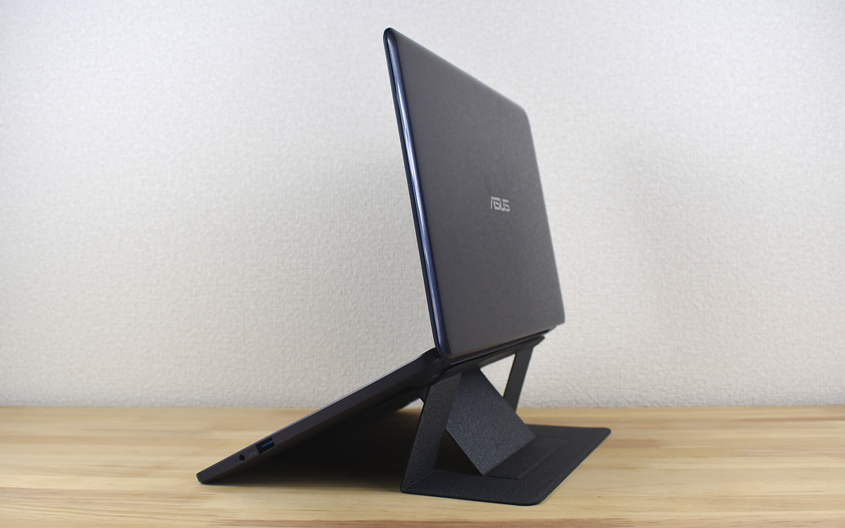 それでは楽な姿勢でタイピングができるのか試してみましょう。まずノートPCに「Laptop Stand」を装着。折りたたみ時は厚みが約3mmしかないので、邪魔になるという印象はまったくありません。