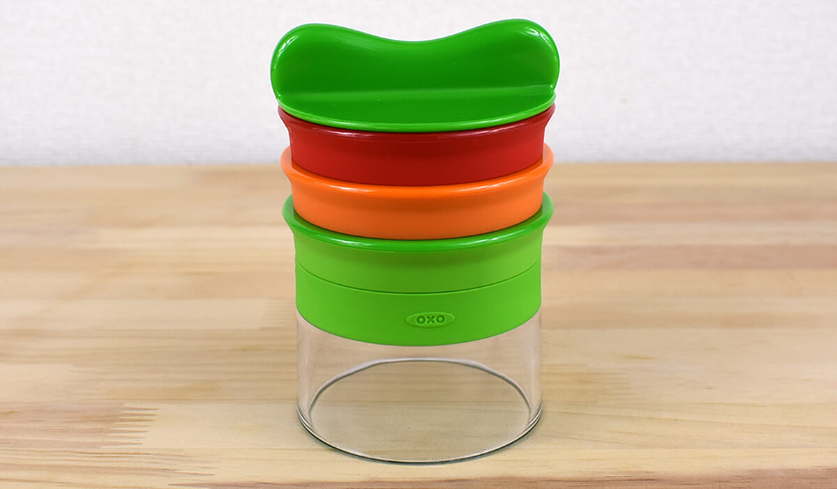 円柱に近い形状の同商品は、大きさ約8.5(縦)×8.5(横)×12.5cm(高さ)。コンパクトで、キッチンの脇に置いていてもスペースをとらないサイズ感です。上部についたカッターは赤や黄緑などカラフルなデザインで、オシャレな見た目。キッチンのインテリアにこだわっている人にもオススメなグッズです。