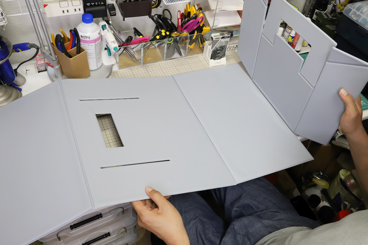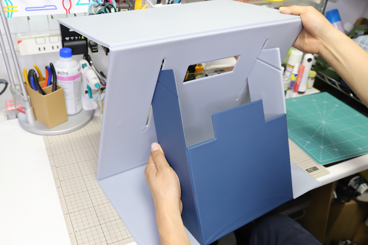 これをいったん広げ、折り紙を折るようにパタパタと組み立てると、立体的なスタンドに変形するという構造だ。