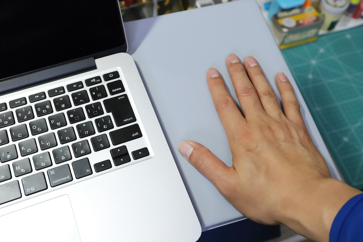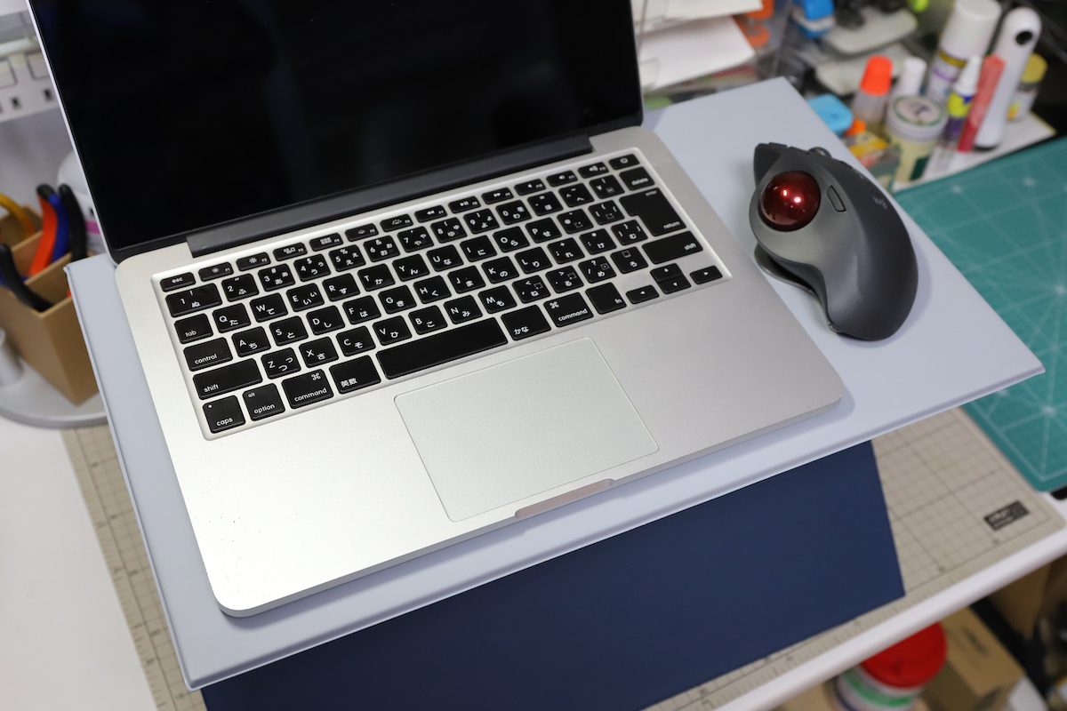 ちなみにスタンドの天板面は260×450mm。13インチのノートPCを置いて横が少し余るぐらいの面積があるので、マウスや外付けテンキーなんかも置いて使うことができる。また底面積も板面と同じなので、机にA3のコピー用紙が置けるぐらいの空間が空いていれば、まず設置に問題はないだろう。