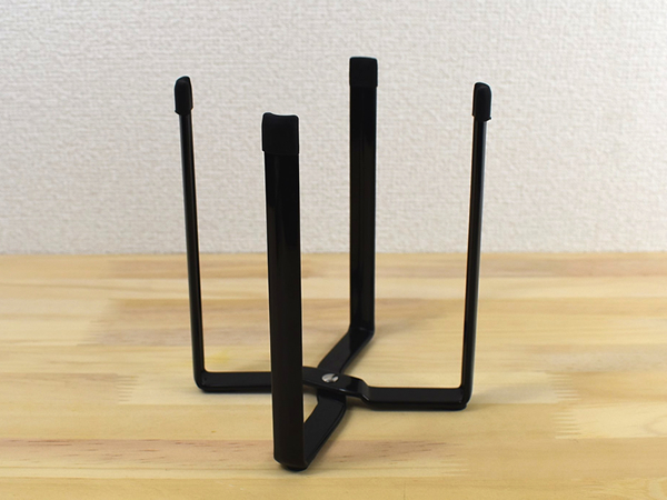 パッケージを開けると、大きさ約14.5(幅)×3.5(奥行)×16.5cm(高さ)ほどの折り畳まれたスタンドが登場。コの字型のスタンドはかなりコンパクトで、ちょっとした隙間などにも保管可能です。スタンドを広げても約12(幅)×9.5(奥行)×16.5cm(高さ)と小さいままなので、設置してもキッチンの場所を取りません。