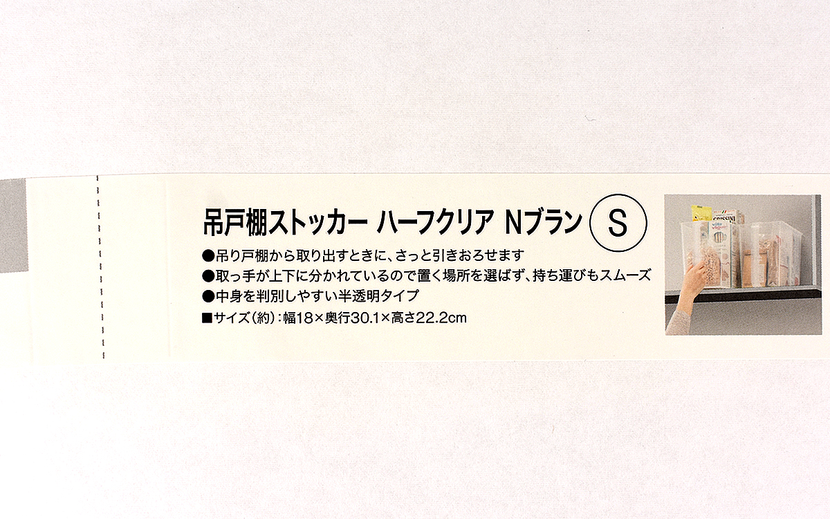 調理器具や食料品のストックなど、キッチンの吊り戸棚には収納しておきたいものが沢山ありますよね。ただ、いちいち手を伸ばして取り出さなければいけないのが地味に面倒……。そんな悩みを解消してくれるのが、ニトリの「吊り戸棚ストッカー Nブラン」(499円/税込)です。今回はSサイズで半透明のハーフクリアをチョイスしました。