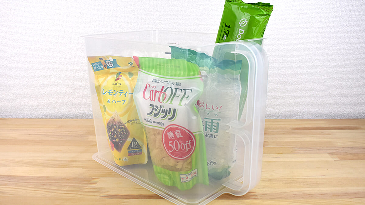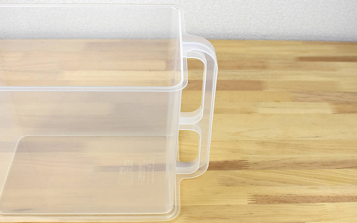 サイズは約18(幅)×30.1(奥行)×22.2cm(高さ)と、しっかり高さがあるためパスタなどの細長い物も立てて入れることができます。真ん中が区切られた取っ手は手がすべりづらく、高い位置から引っ張り出す際もしっかり握れそう。半透明なので、ストッカーに入ったままの状態でも中に何が入っているのか判別しやすいのもポイントです。