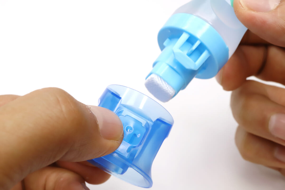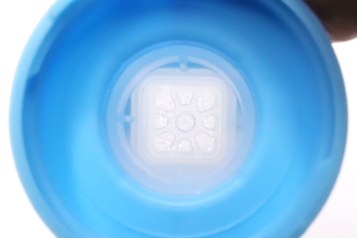 もちろん液体のりジャンルにも、ハケ型ヘッドやシリコンの角型ヘッドなど、カドに塗りやすいヘッド形状の既存製品はいくつかある。ただ、それらはハケやシリコンヘッドの中央に小さなのりの吐口が開いており、そこから染み出た液体のりをヘッド表面に広げて紙に塗るという構造だったのだ(もちろん、乾燥をできる限り防ぐため)。それでは、どうしても塗りムラができるし、のり量のコントロールも難しい。