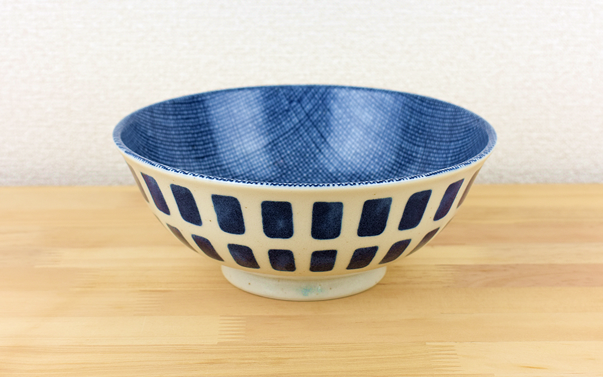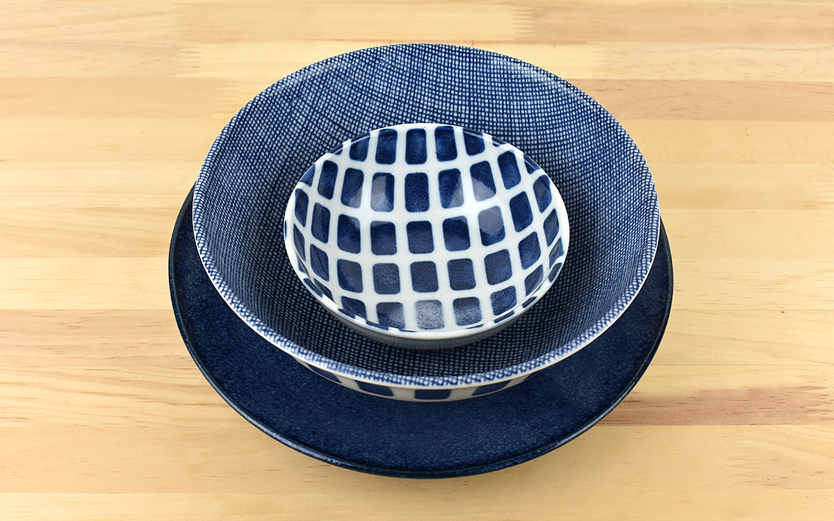 「青格子」の麺鉢は、ほどよい大きさの19.5(幅)×19.5(奥行)×8cm(高さ)。同じく「青格子」の小鉢は12.3(幅)×12.3(奥行)×4.5cm(高さ)と比較的コンパクトなサイズで、やはり従来の小鉢よりも明らかに軽い印象を受けました。