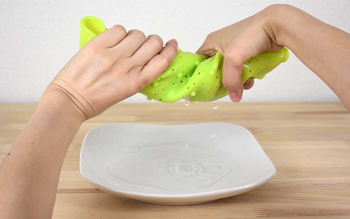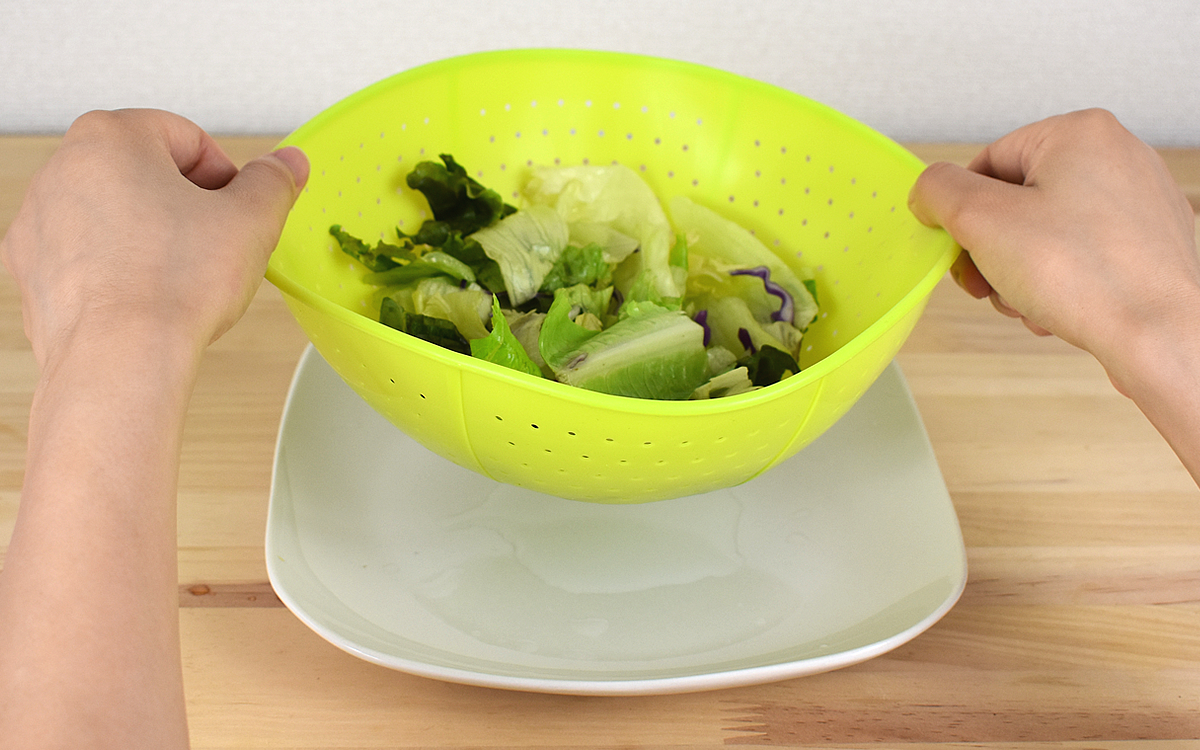 まずは、実際にレタスなどの野菜を同商品に入れて洗ってみます。そして、同商品の本領を発揮するのは水切りをしたあと。ざるを丸めて野菜ごとぎゅっと絞ると、残っていた水分がポタポタと穴から落ちてきました。余分な水を取り除ける一方で、野菜のみずみずしさも損なわれていません。直接食材に手を触れる必要もないので衛生的にも安心ですよ。