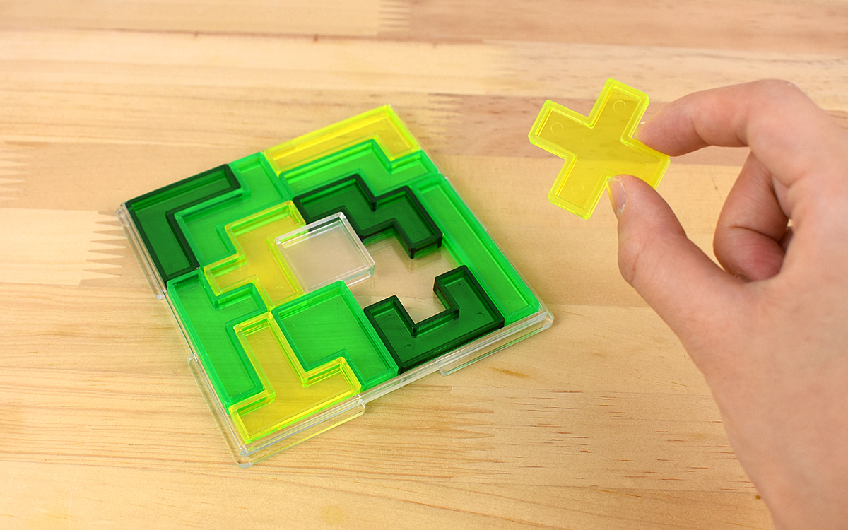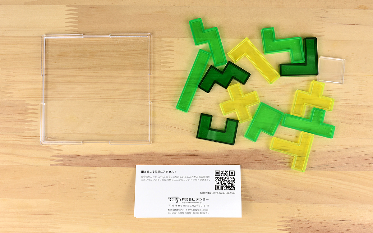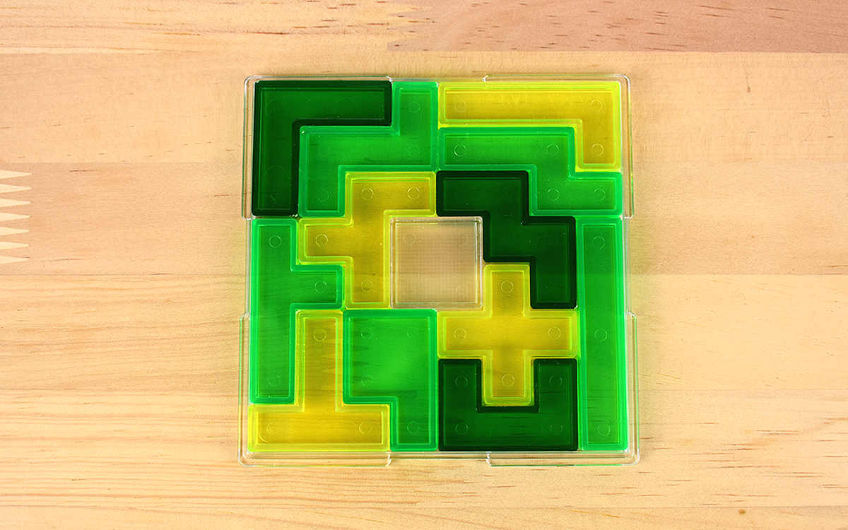 遊び方はシンプルで、ピースを取り出してケースに戻すだけ。それだけのことなのに、遊ぶたびに正解が変化するという難しさを存分に楽しめるのが特徴です。今回紹介する「ペントミノ・スクエア」も、なんとピースの入れ方は1万6146通り! パッケージの説明によれば1日に1つの組み合わせを作ったとしても、全てのパターンを見つけるのに44年と3カ月掛かるとか。