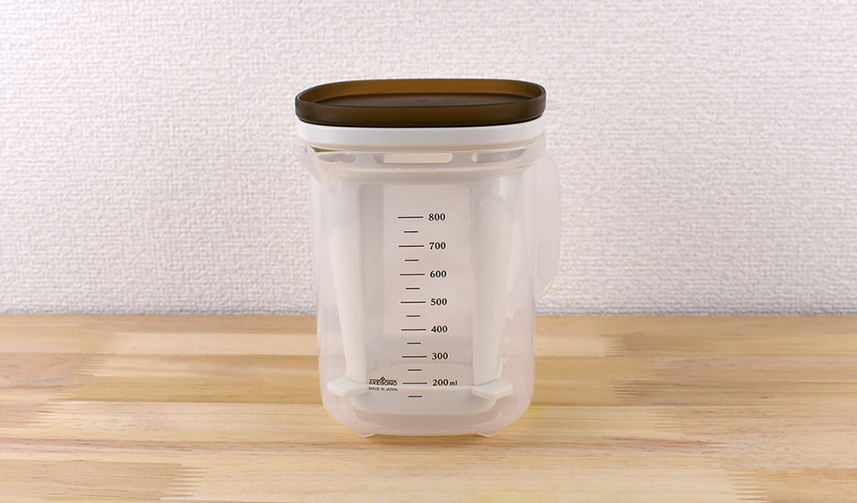 容器の側面に目盛りがついているのも特徴。これなら作っただしを計量カップに移し替えることなく、そのまま料理に使えますね。さらに容器のフチに注ぎ口があることによって、こぼさずラクラク使用できそうです。