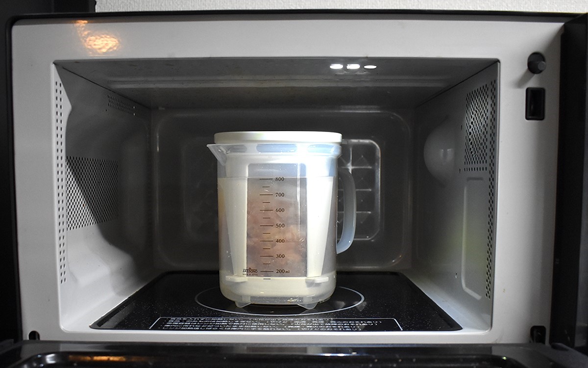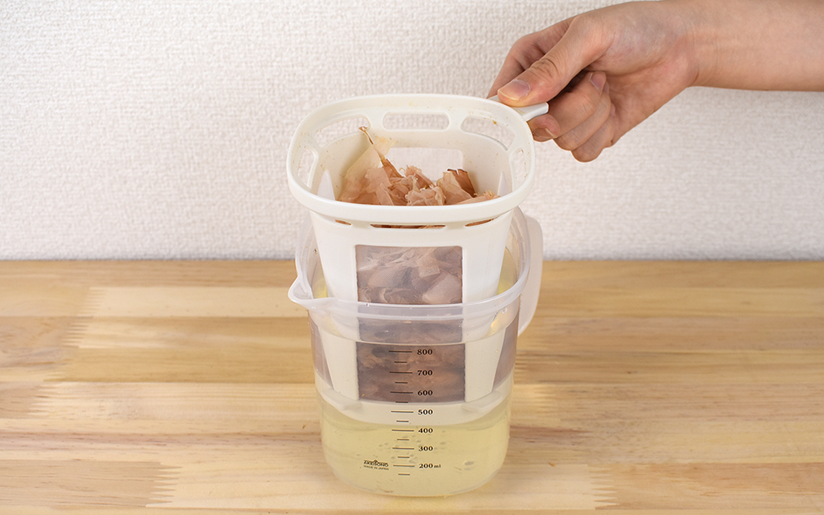 昆布や煮干しなど様々な種類のだしが取れる同商品ですが、今回は鰹節を使った鰹だしにチャレンジ。まずはこし網に鰹節を入れましょう。続いて容器に約800mlの水を入れ、先ほどのこし網をセットしてください。あとは600Wの電子レンジで7分間加熱するだけ。こし網を引き上げれば、驚くほど手軽に本格的な鰹だしが完成しました。