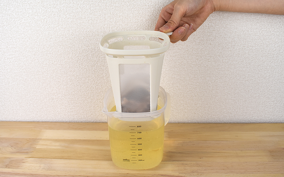 取れただしは美しい黄金色。挽きたてならではの豊かな香りが漂います。同商品はフタ付きなので、余っただしを保管しておきたいときにも困りません。また、こし網の底面は取り外すことが可能。だしがらを取り除くのが簡単なため、しっかりお手入れができますよ。