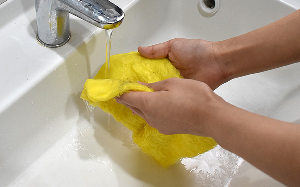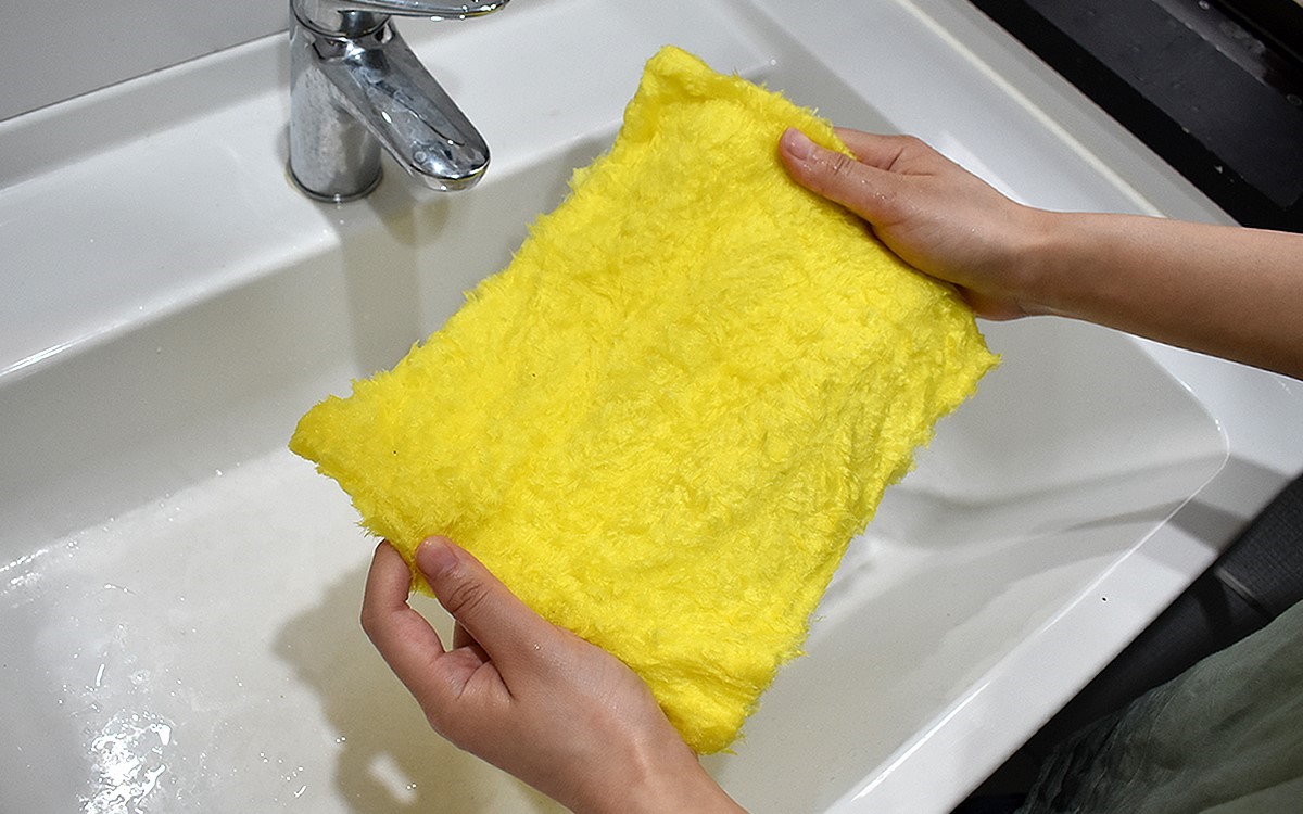 気になるのはクロスについた汚れ落としですが、こちらも心配ご無用。しばらく手もみすると、すっかり汚れはなくなっていました。公式サイトによれば毛足は細かな繊維が約30本絡みついた構造になっていて、水に濡れると繊維が広がって汚れを放出するそう。