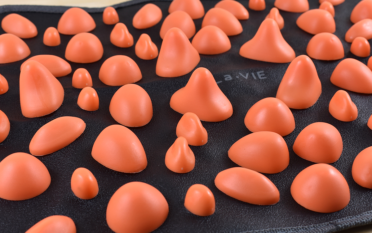 マットに取り付けられた突起は、形状が異なる大小6タイプ。緩やかなカーブを描く突起はまだしも、“とんがり山”と呼んでも過言ではない突起は見るからに痛そう……。