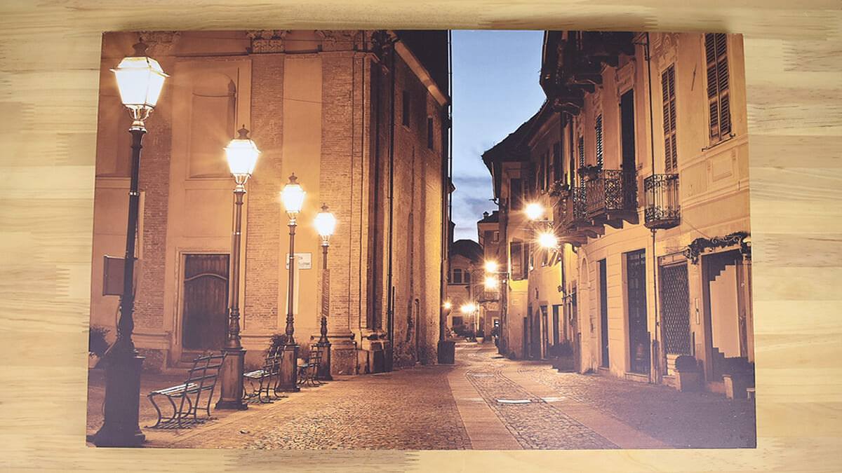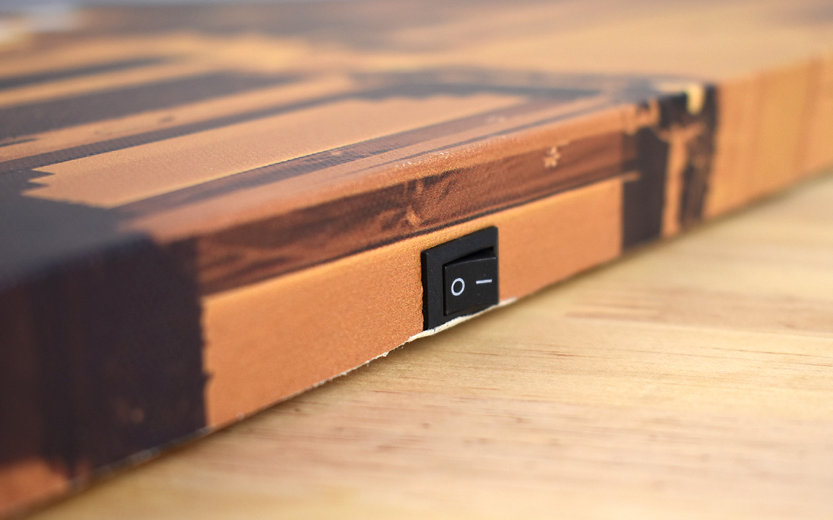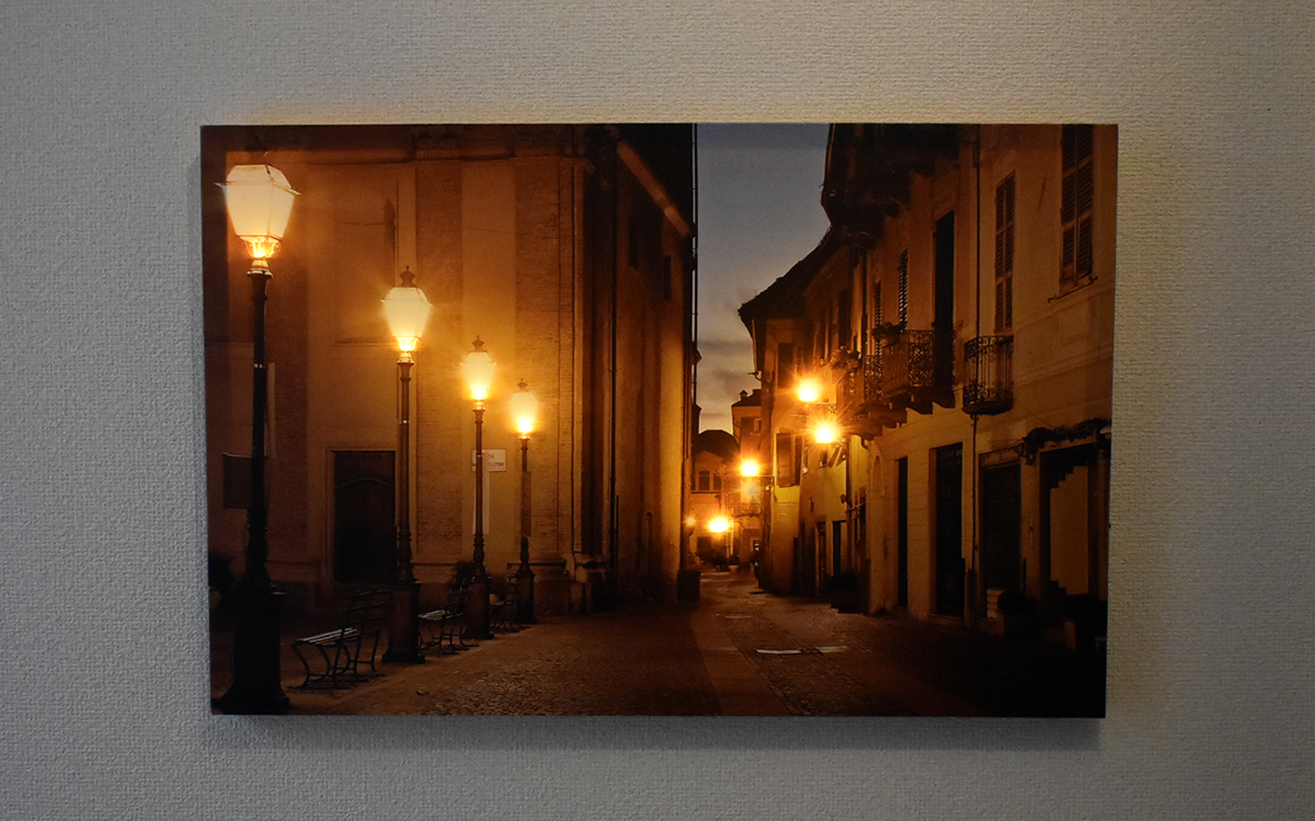 セッティングが完了したら、あとは側面にあるスイッチでオン・オフを切り替えるだけ。実際に部屋を暗くして、LEDを点灯したのが下の画像です。ご覧のとおり街灯部分に仕込まれたLEDが淡い光を放ち、ポスターというより実景を眺めているような気分にならないでしょうか。リビングに限らず、たとえば寝室のベッドサイドに飾れば雰囲気満点。風景そのものが絵になるため、日中LEDを点灯していなくてもインテリアとして抜群の存在感を放っていました。