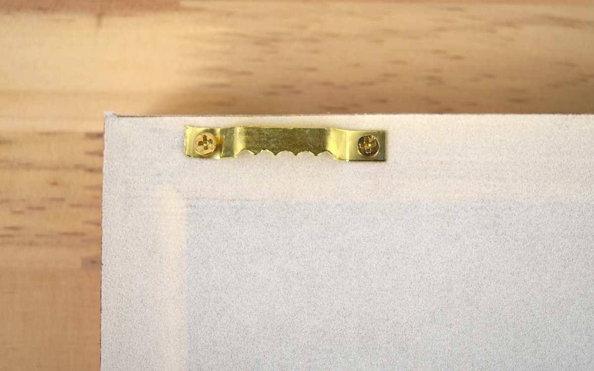 同商品のサイズは59(幅)×3(奥行)×38.5cm(高さ)。キャンバスはパインを素材にしていますが重量は約350gと軽く、手にした印象も見た目ほどの重さは感じません。キャンバス裏面の両端には、取付金具に引っかけるギザギザのついた金具が。また下部には乾電池を収めるポケットがあるので、単3形乾電池2本をセットします。