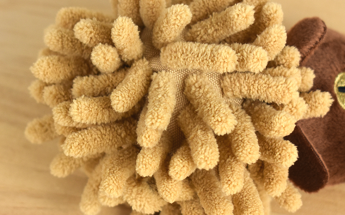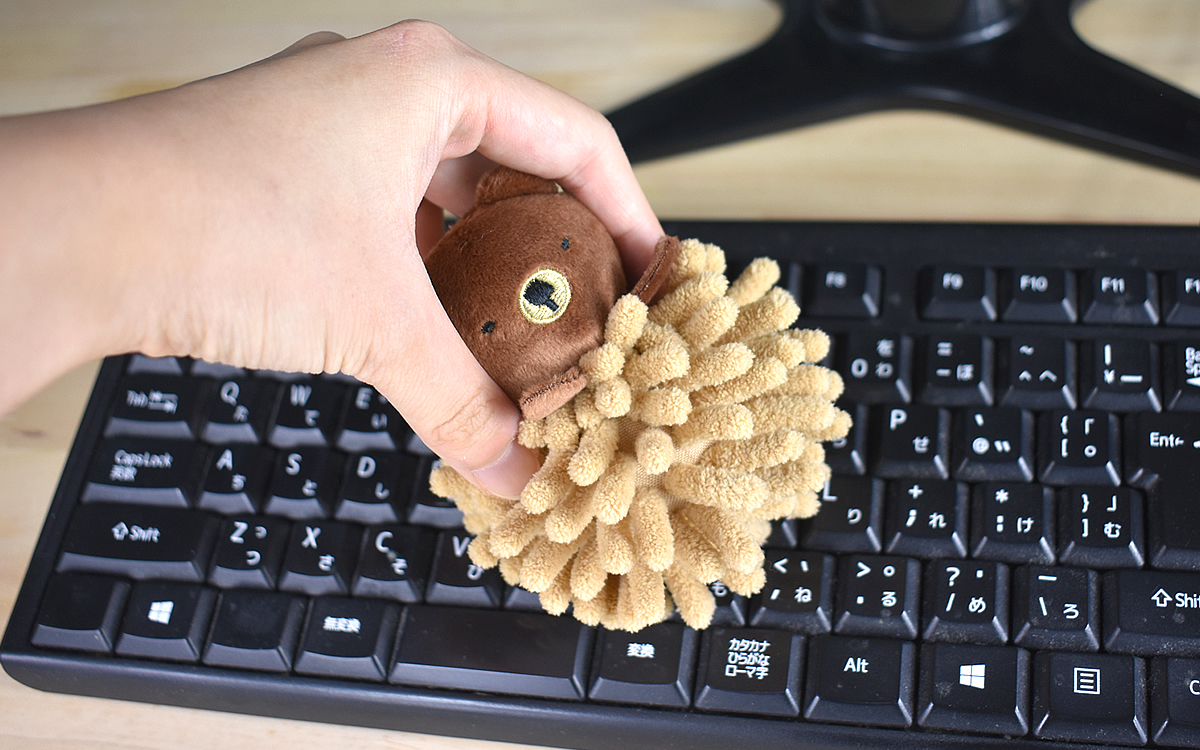 まるでクマとミノムシが合体したような見た目のクリーナーですが、ポリエステル100%の繊維が持つ能力は本物。試しに卓上をサっとひと拭きしてみたところ、マイクロファイバーの静電気によって小さなホコリもしっかりキャッチしてくれました。クリーナーの繊維1本1本が細かいため、キーボードの隙間にもしっかりフィットしますよ。