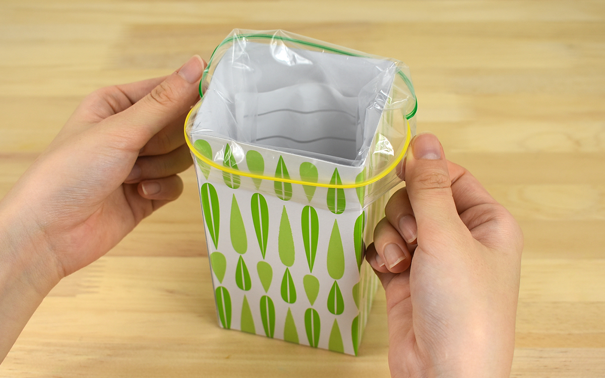 実際に使う際は本体を広げて箱状に組み立てましょう。あとはホルダーの内側で保存袋を広げ、口の部分を折り返して引っ掛けるだけ。手で支えなくても口が開いた状態をキープでき、食材を詰める最中もジッパー部分が汚れづらくなりますよ。