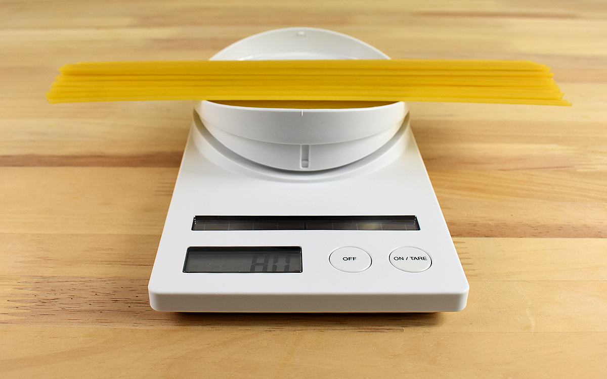 計量皿はふた付きで、逆さにすると凹みのついた“小皿”に変身。ガイドに合わせて計量皿の上にセットすれば、ロングパスタを量ることが可能です。実際にパスタを計量してみたところ、スケールから滑り落ちることなく楽に量れました。