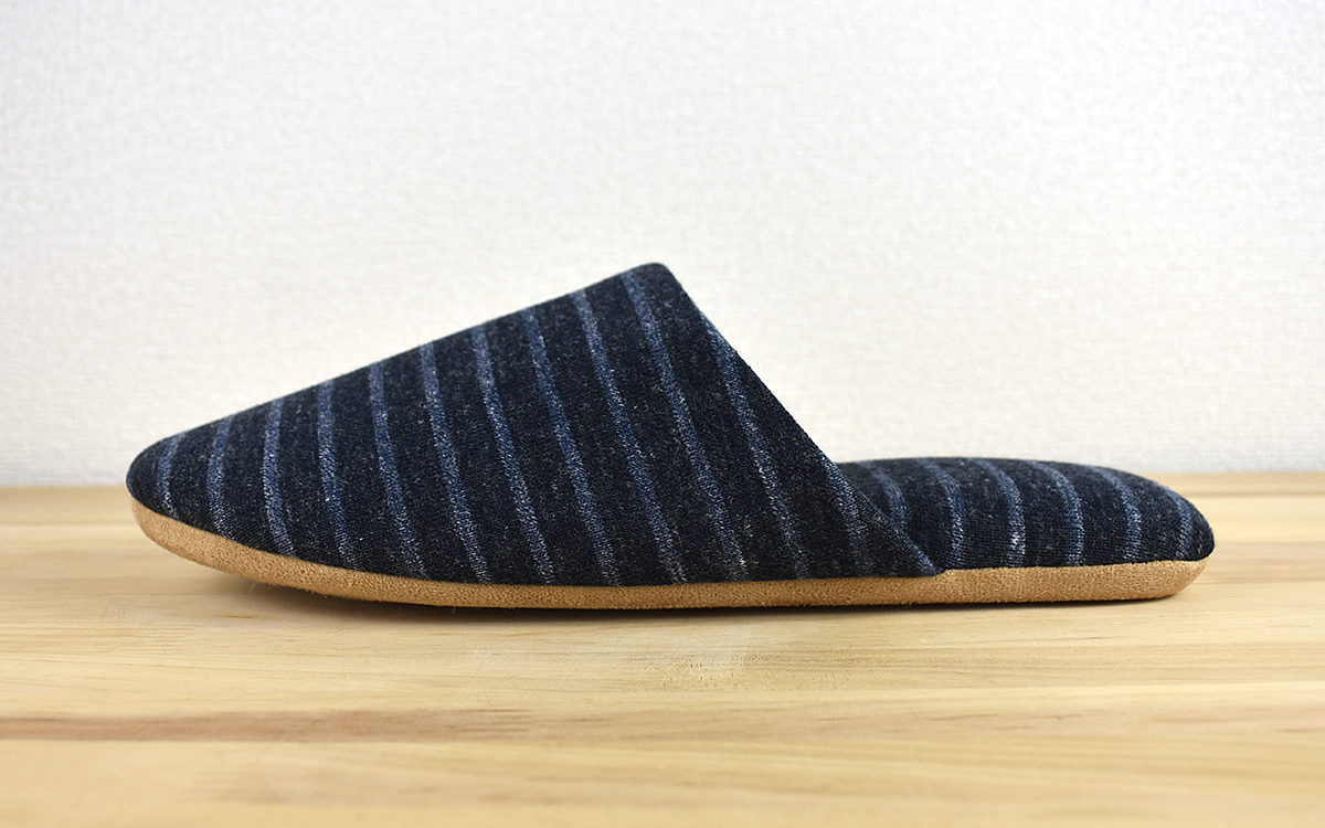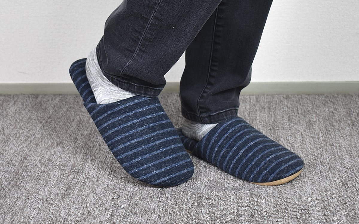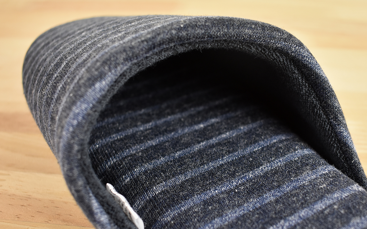下の画像を見てわかるとおり、従来のスリッパよりも生地は厚め。インソールもふっくらしていて、実際に履いてみたところ足の裏にソフトな感触が。また甲全体をしっかり包み込んでくれるので、足を上げてもかかとの部分がぱかぱかと浮くことはありません。