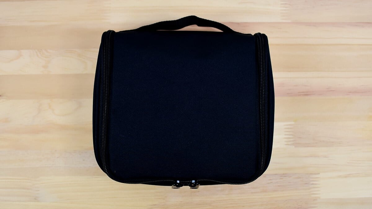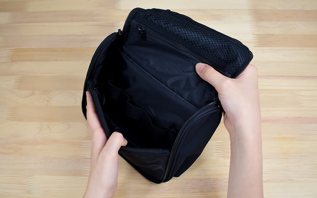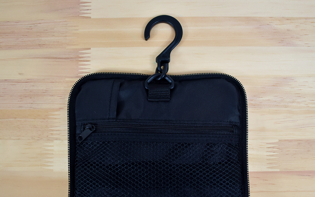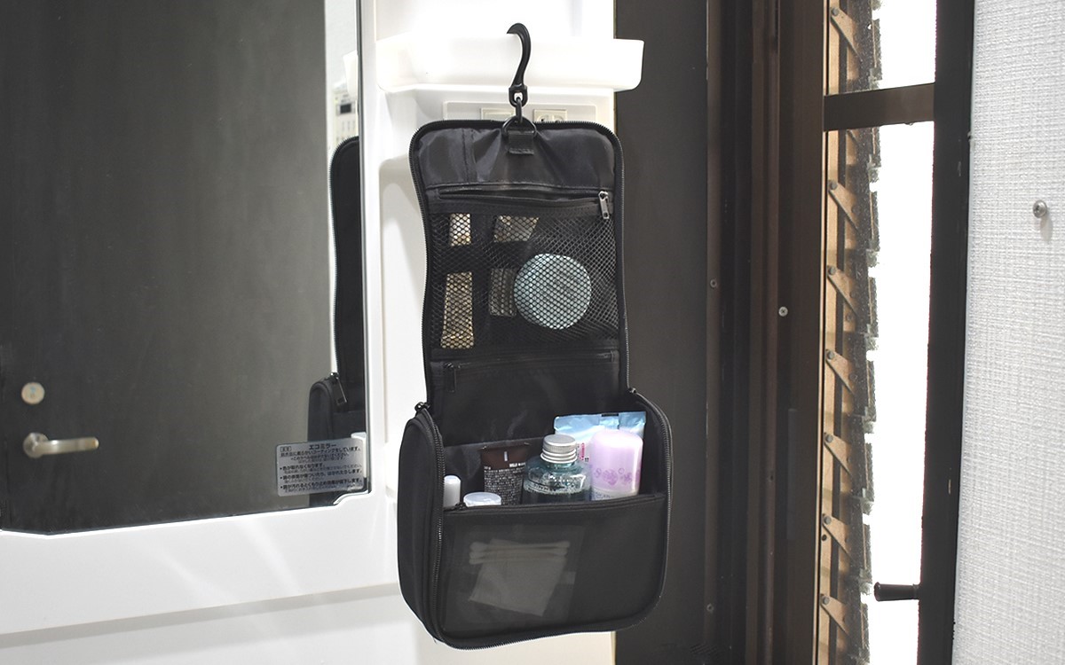 黒一色でシックな印象の同商品。手提げがついているので一見ポーチのように見えますが、ファスナーを開けてみると吊り下げ用のフックが。ケース内は化粧水ボトルが入るほど口が広く、内側にはバンドが縫い留められているので歯ブラシやペンシル型のメイクグッズを立てるのに役立ちます。