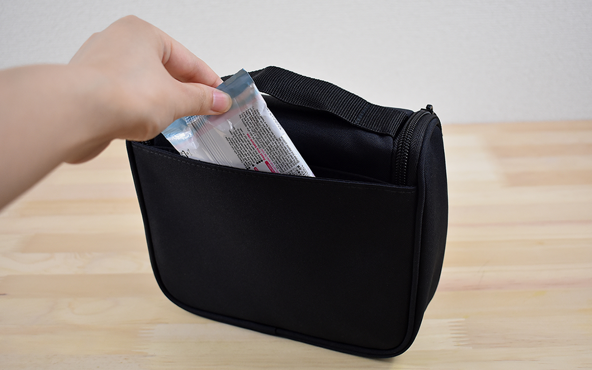 実際に洗面用具を入れ始めて、真っ先に驚かされたのが収納力です。たとえばケース背面のポケットには、制汗シートなど厚みがないアイテムをストックしておくのにぴったり。フタの内側とケース手前のメッシュ生地のポケットは、よく使用する小物類を入れておくとパっと取り出しやすいのではないでしょうか。