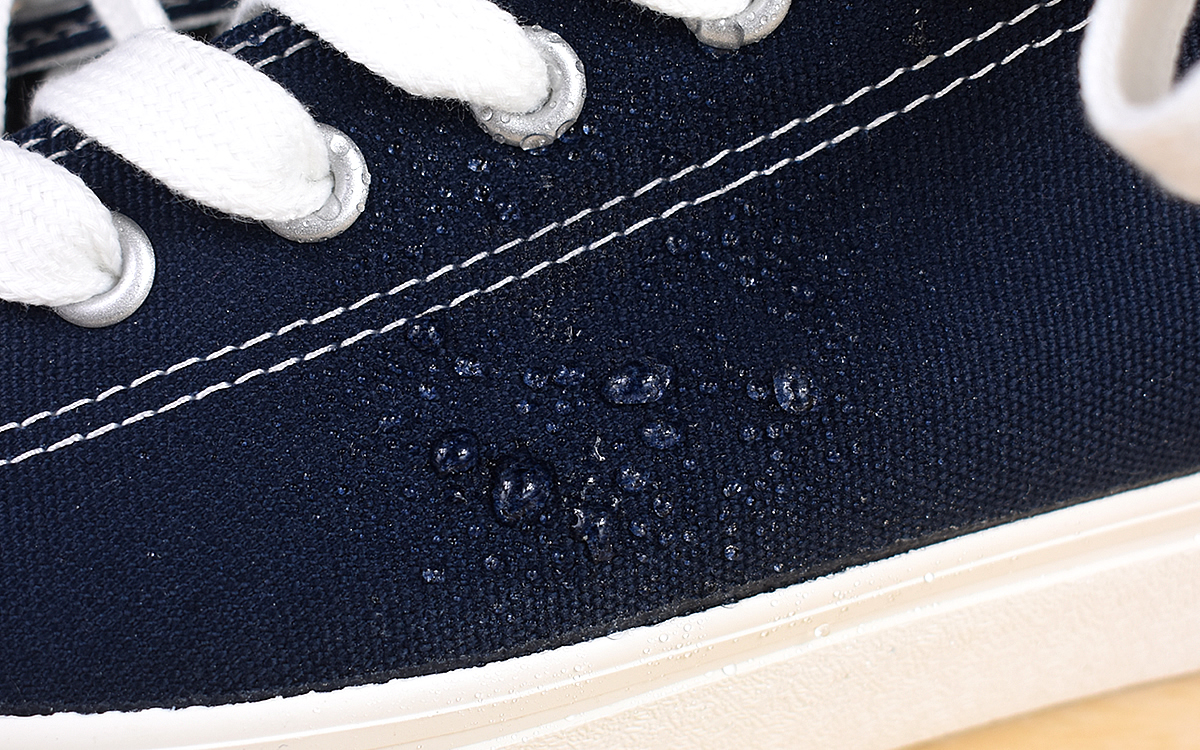 オーガニックコットン100%の生地は触り心地がいいだけでなく、撥水加工を施しているのも特徴。ご覧のとおり吹きかけた水滴をしっかり弾き、撥水効果の高さが実感できます。