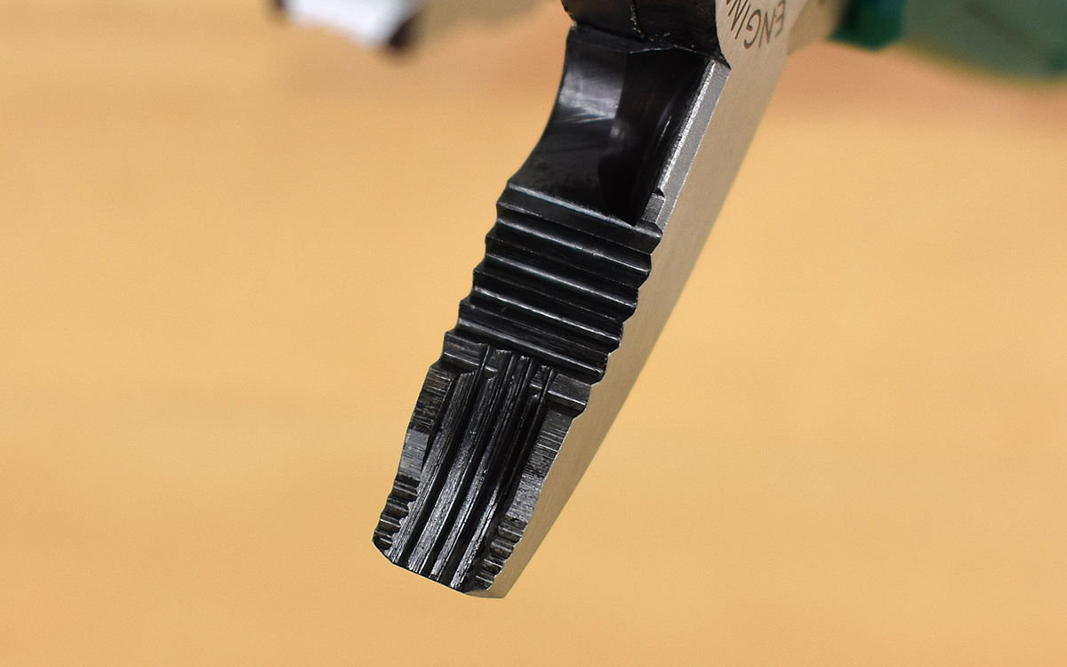 同商品の先端をよく見ると、横向きの溝とともに従来のペンチにはない縦向きの溝が。どうやら縦の溝をつけたことによって、ネジの頭にしっかり食らいつけるようです。