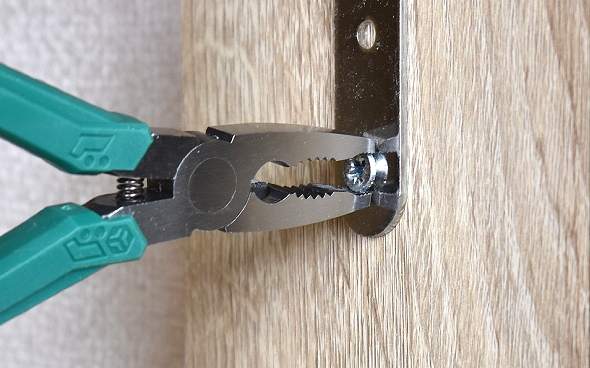 それでは懸案の頭が潰れたネジを外してみましょう。金具からわずかに飛び出しているネジの皿部分を挟むと、滑ることなくグっと噛む感触が。そのまま反時計回りに回し、ドライバーでは外せなかったネジを無事抜くことができました。