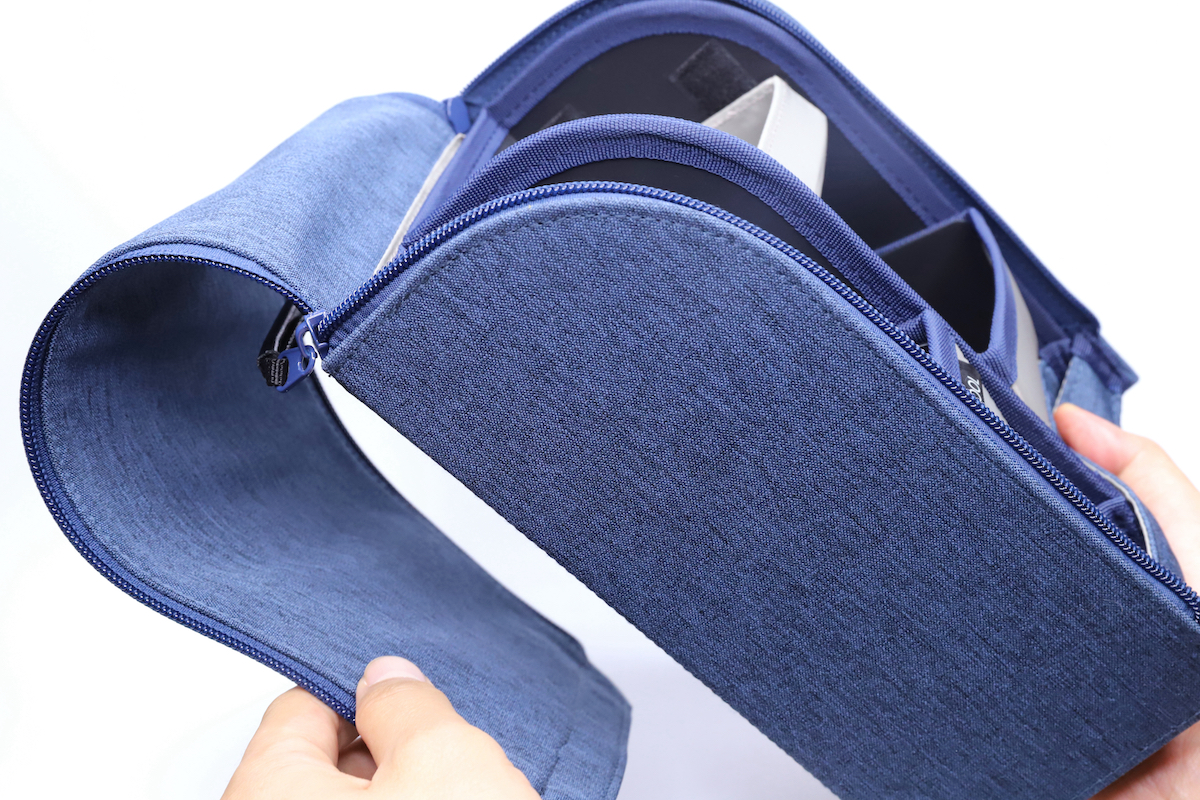 使用する際は、まずダブルジッパーを引き上げて、前面カバーをめくり上げる。めくったカバーを後ろに回すと内蔵する磁石でピタッと固定される、という仕組みは、シリーズ共通だ。