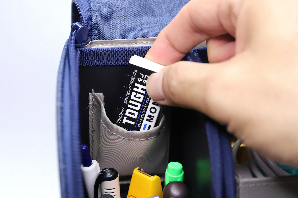 また、ペンケースユニット上段はポケットになっている。消しゴムやテープのりなど、こちらも同様に、バスケットに入れてしまうと沈んでしまう小物を収納するのにちょうどいい。