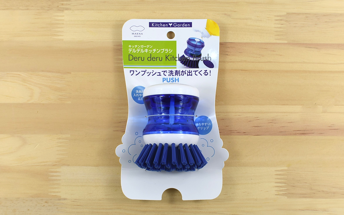 スポンジでは落とせない汚れのついた食器類や焼き網。ブラシにバトンタッチして洗うとしても、毎回洗剤をつけ直さないといけないのが手間ですよね。そこで便利な洗浄グッズはないかと東急ハンズをチェックしていたところ、「デルデルキッチンブラシ」(638円/税込)というユニークな名前の商品を発見。青・黄・赤色のカラーバリエーションから、水回りになじみやすい青色タイプを購入してみました。