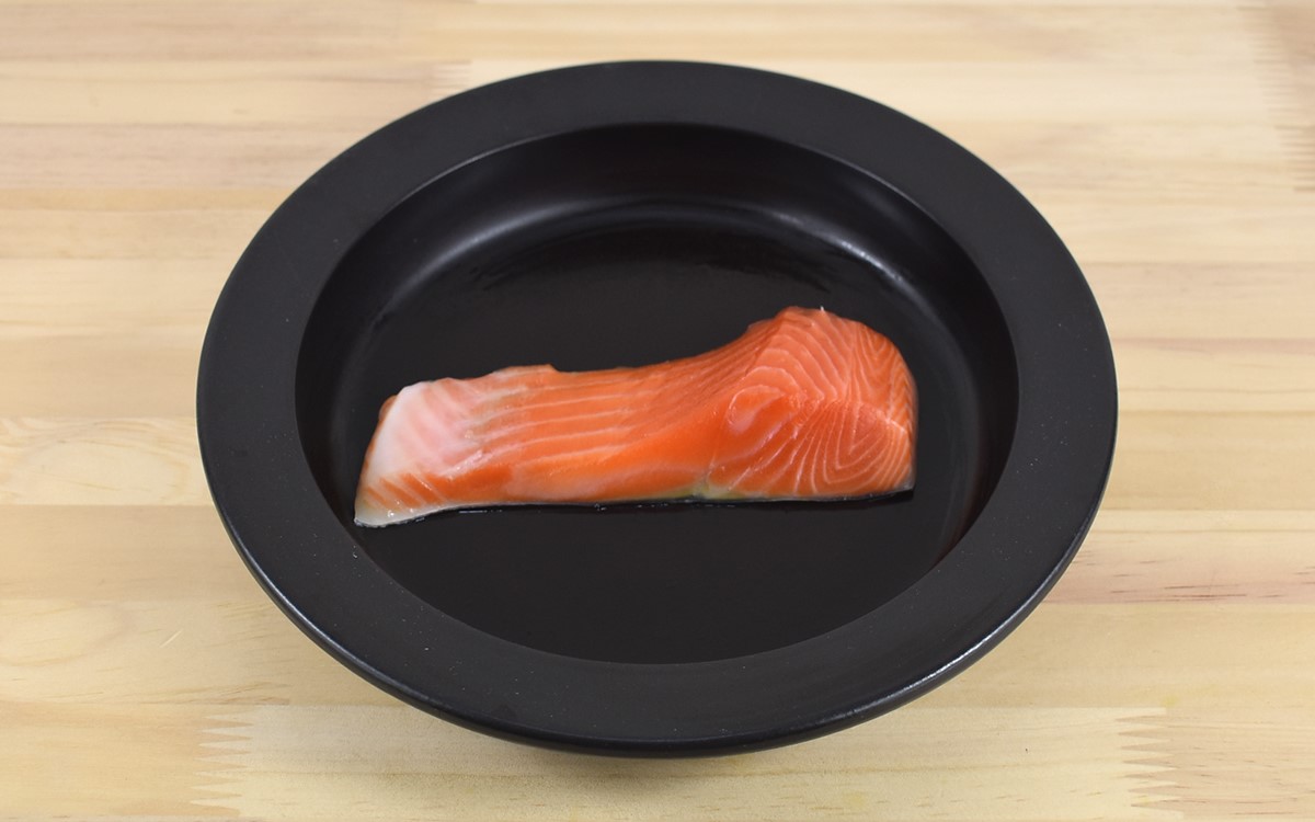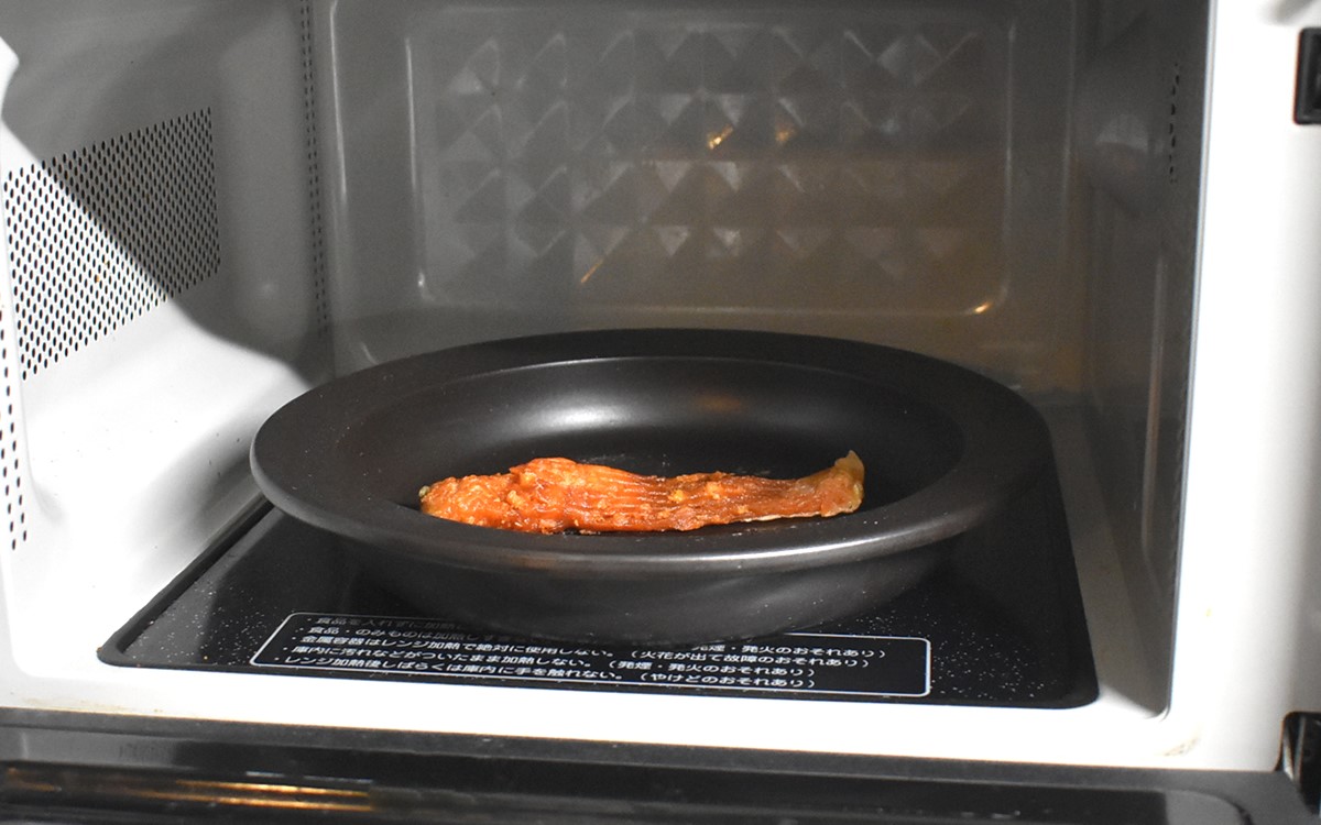 さっそく電子レンジでの調理を試してみましょう。焼き加減を確認するべく、鮭の切り身を用意。レンジで加熱を終えて取り出すと、こんがり焼けた鮭からこうばしい香りが漂いました。均一で美しい焼き上がりです。焼きムラになりにくいのは火加減の調整が必要ないからだそう。フチがぐるっと1周についているので、熱々の皿をミトンで掴むのも楽々ですよ。
