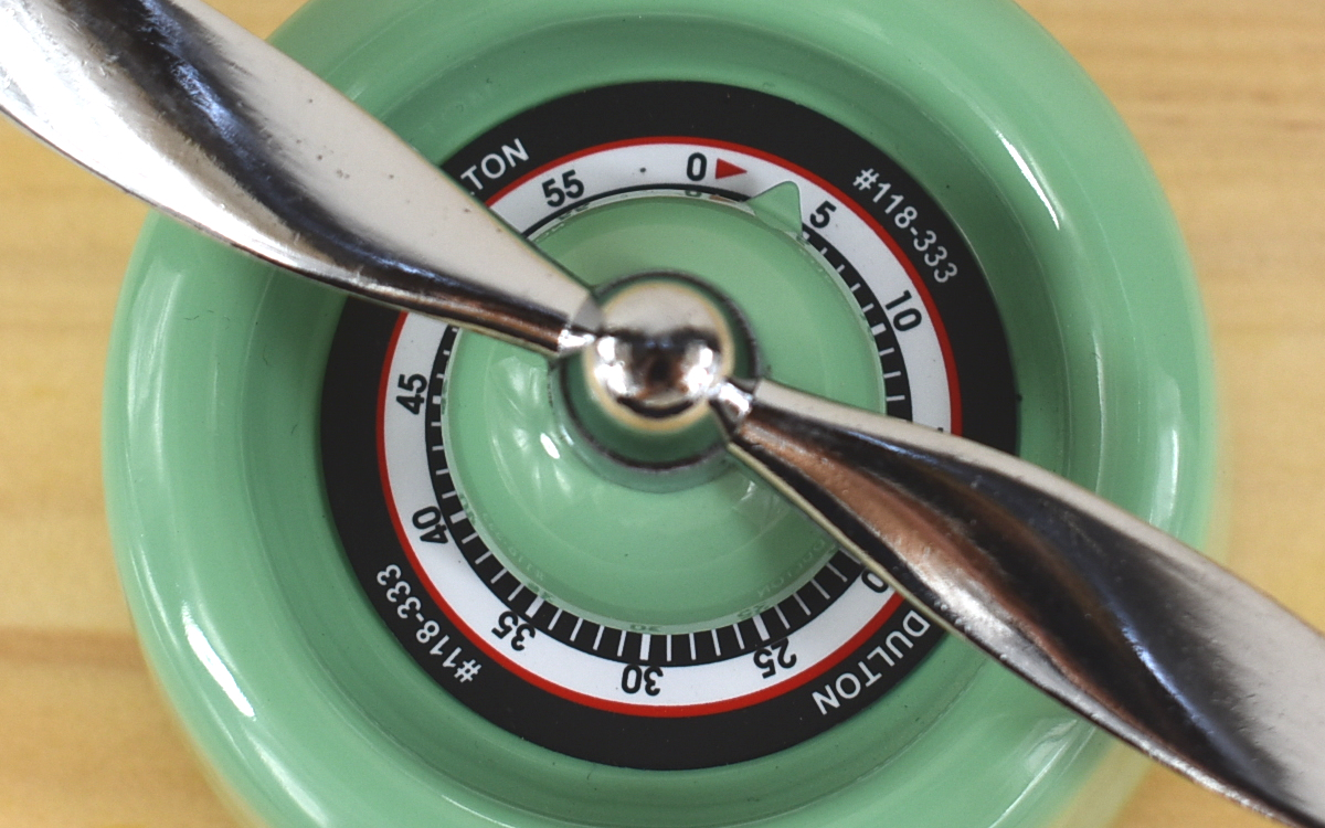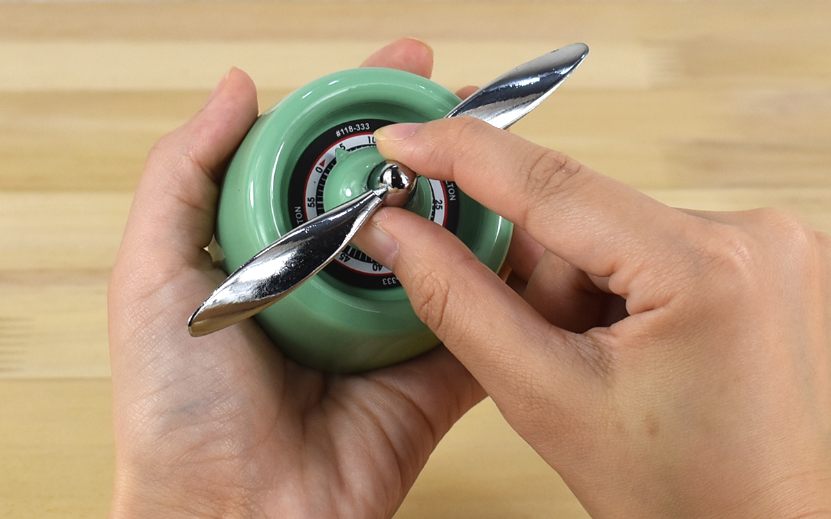 それでは実際にタイマーを使ってみましょう。まずはプロペラのつけ根をつまみ、時計回りで「55」の位置まで回します。あとは設定したい分数に向けて、反時計回りにゆっくり回していけばOK。デジタル製品とは異なり、時を刻むゼンマイ式ならではの“音”が心地よさを感じさせてくれました。
