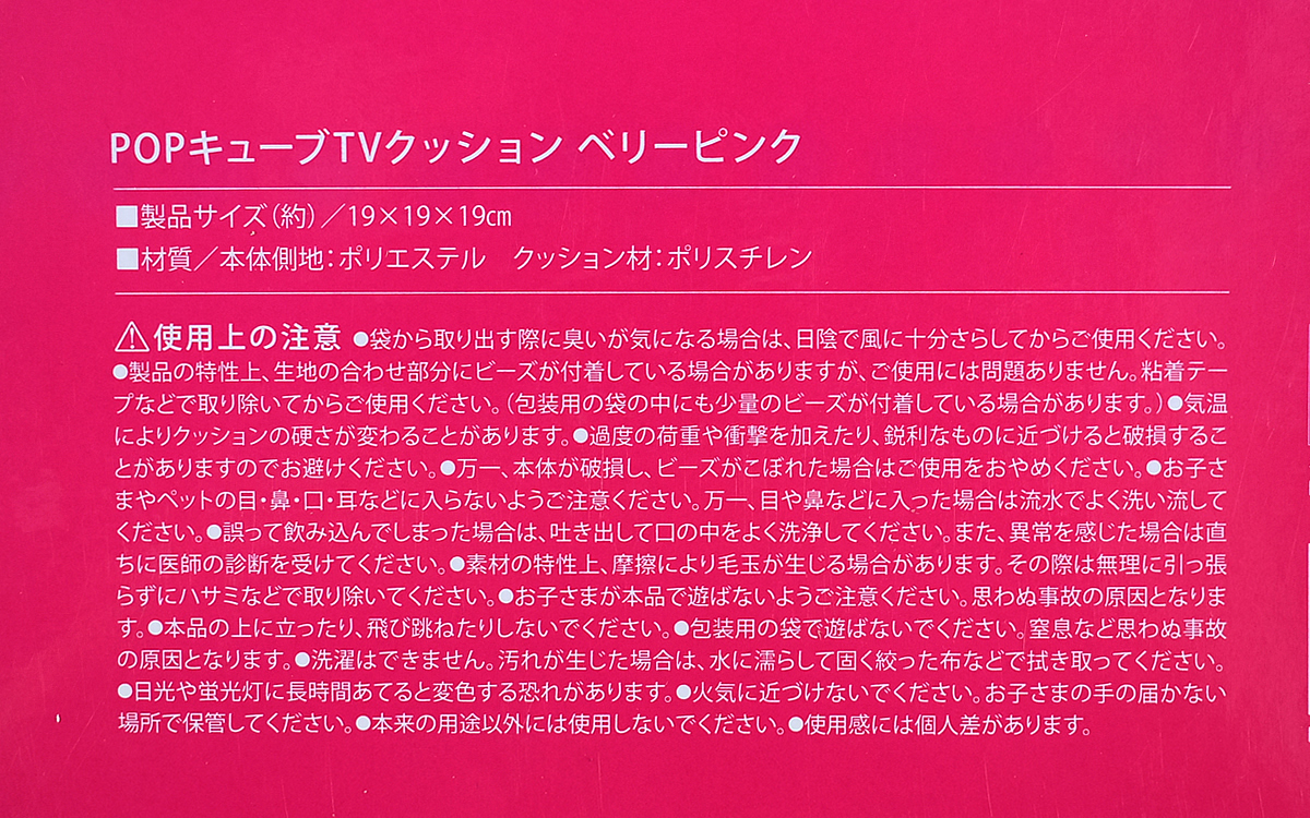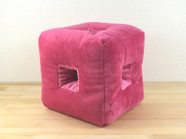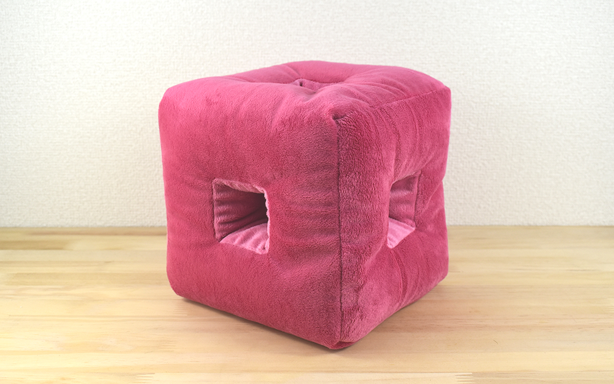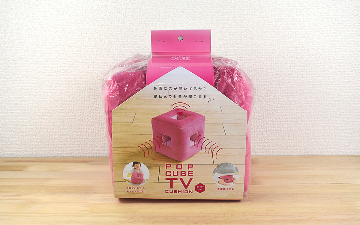 自宅でのリラックスタイム中、寝転んでのんびりとテレビや動画を見るのは至福の時間ですよね。しかし頭を枕やクッションにのせて横になると、片耳が塞がって音が聞こえづらくなることも。そんなちょっとした悩みを解決してくれるのが、「POPキューブTVクッション」(2980円/税込)です。横向きに頭をのせても音が聞こえやすいように、耳が当たる部分に穴が開いているのが特徴。珍しい形に目を惹かれ、「ベリーピンク」のカラーを購入しました。
