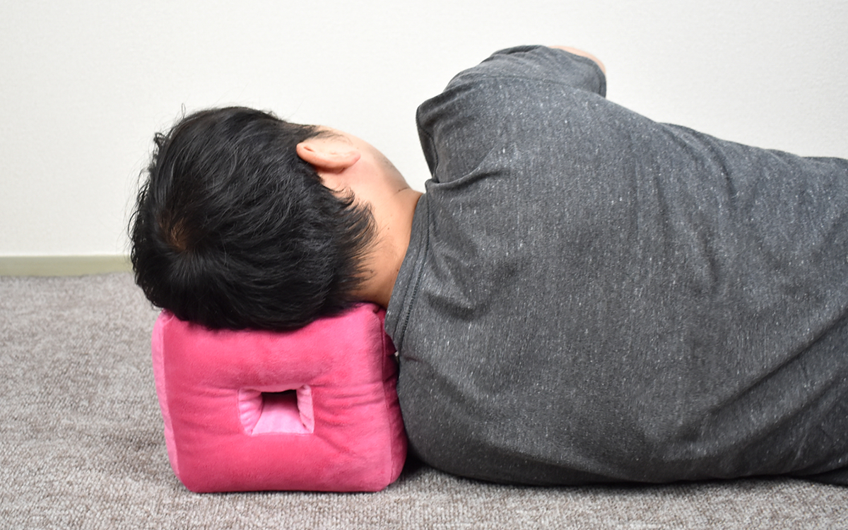 実際に寝転んでみたところ、ほどよい弾力感がありしっかりと頭を支えてくれました。中には細かいビーズが詰まっていますが、ふにゃっとした柔らかい作りではないので安定感はバツグン。普通のクッションであれば耳が塞がってしまうはずの部分に穴が開いており、圧迫感はありません。人の声や音楽が問題なく聞こえてきますよ。